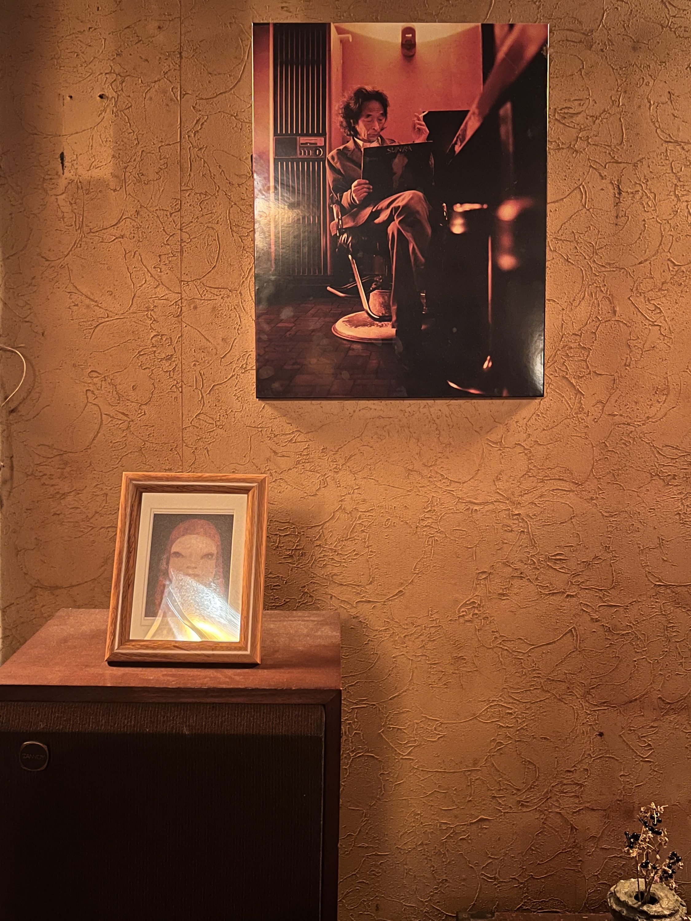 そこには私が今まさに腰掛けている椅子でくつろぐ、脚の長い男性の姿があった。写真のなかの主人は、手にした一枚のレコードジャケットをしみじみと眺めている。きっと名盤なのだろうが、それがどこのレーベルの、なんというミュージシャンのものなのか、判別出来かねる浅学な自分をすこし呪った。