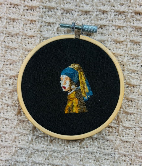 名画の刺繍は、ほんの少しのバランスの違いで再現度や印象が大きく変わる。だからこそ、あえて顔の細かなパーツを省き、表情に余韻が生まれるよう刺繍しているのが私なりのこだわり。原画に近い色合いの糸を何層にも重ねていく過程は、どこか絵を描く感覚にも似ている。