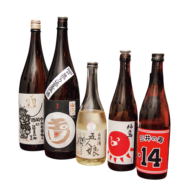 写真真ん中の寺田本家「五人娘純米生原酒 自然のまんま」はナチュラルワイン好きにも人気。