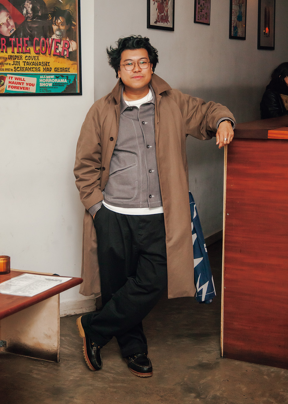 「友達が作るブランドが面白くてね。昔から好きだったブランドと一緒に合わせられるのが嬉しい」と語るように、友人が始めた〈Silphium〉のコートや〈Elarem〉ジャケットに、長年好きな〈Visvim〉のデッキシューズを合わせるニック。「前はもう少し奇抜だったけど、今はシンプルだけど近くで見るとディテールが際立つ服が好きなんだ」