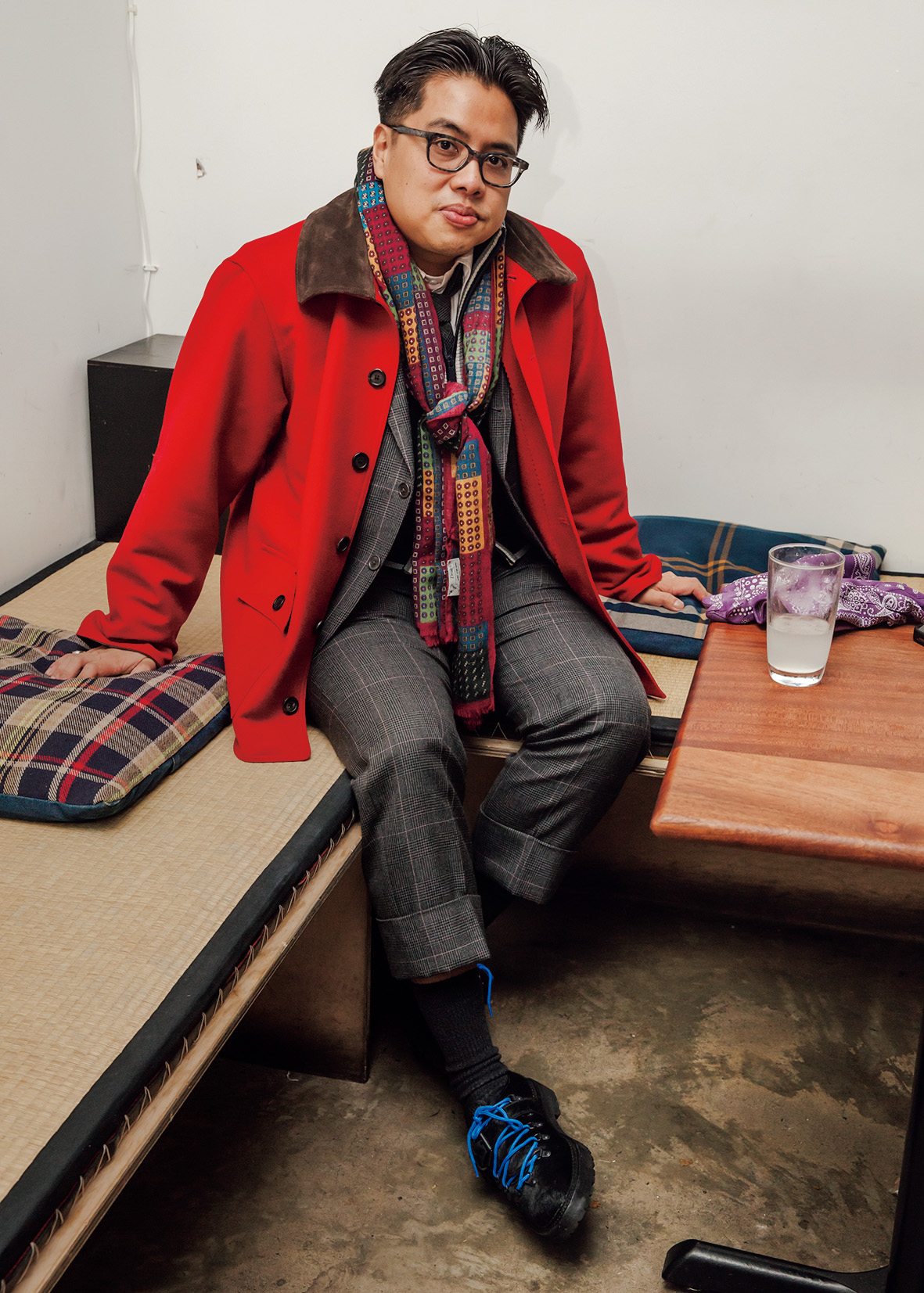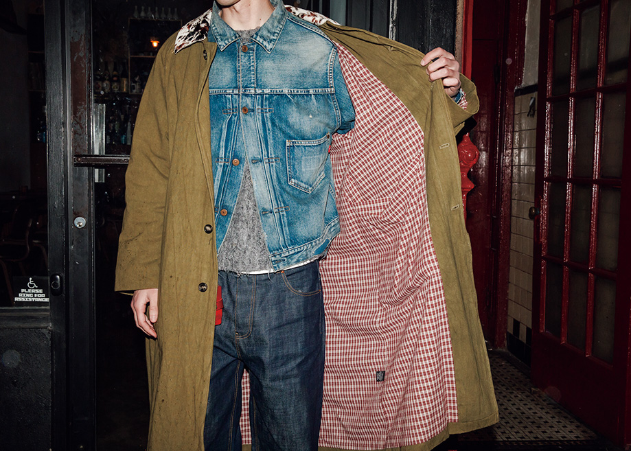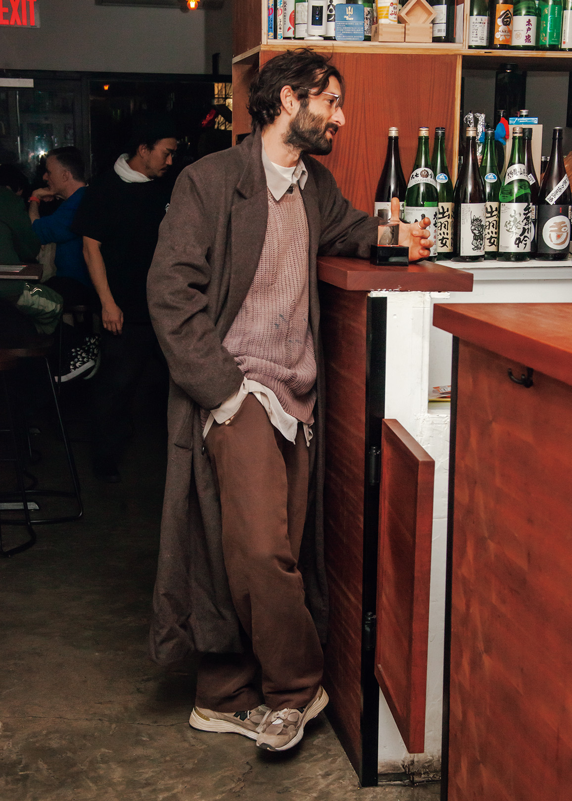 「ヴィンテージの〈コム デ ギャルソン〉のセーターはシミや破れがあって、その自然なエイジングが味になってる。うちの生地もその質感をイメージしてる」。京都の純米酒片手に、いまやNYのセレクトショップ筆頭とも言える〈コルボ〉のタルが着ているコートやシャツは、イタリアで入手したデッドストック生地で作っているとか。