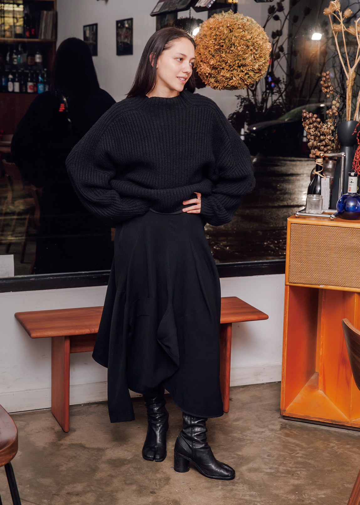 ベーシックで長く使えるものが好きなダコタ。とにかく形が素晴らしいという、元々働いていた今はなきセレクトショップTotokaeloのニットは5年以上大切に着ているとか。普段はドレスパンツばかりだというが、〈COMME des GARÇONS〉のスカートには袖がついていて、そのユニークなデザインとシルエットが最近のお気に入り。