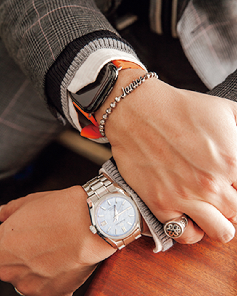 ハネムーンで日本を訪れた際に手に入れた〈Grand Seiko〉の時計とアップルウォッチの2個着け。