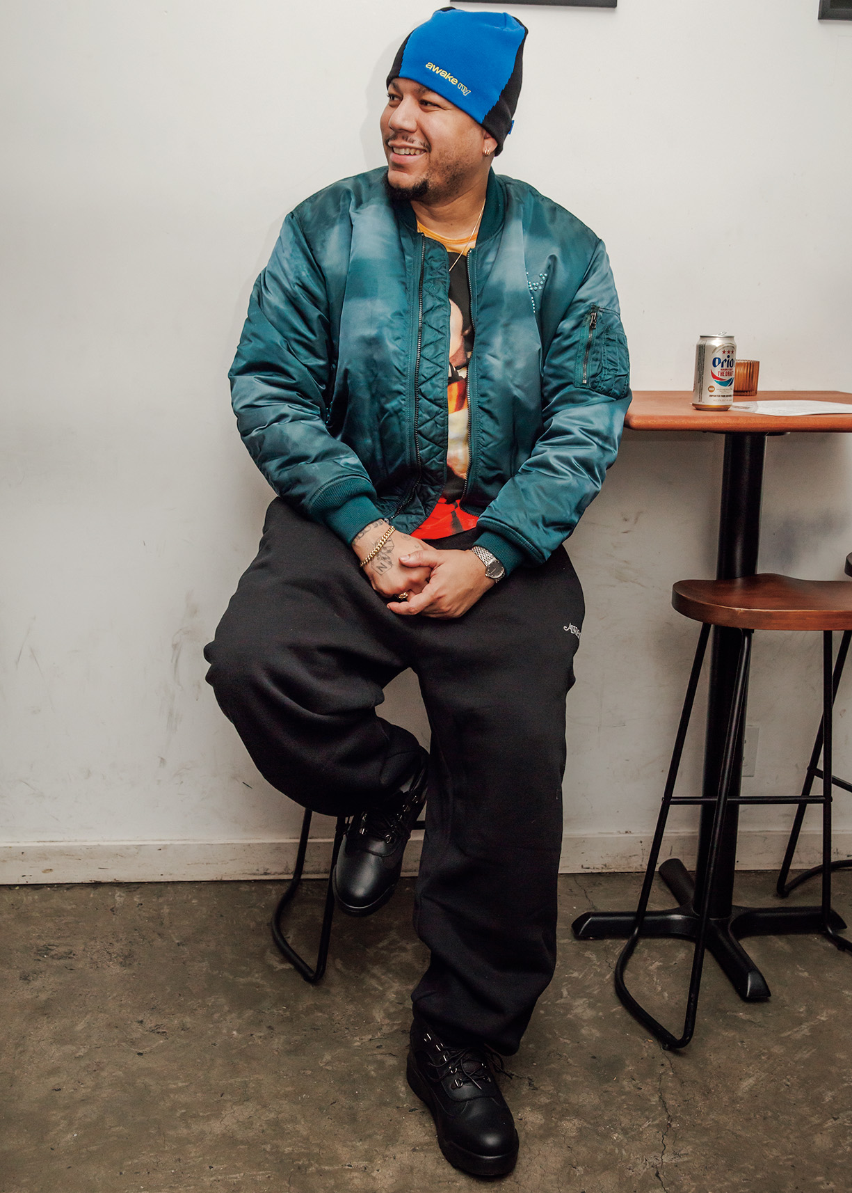 〈アウェイクニューヨーク〉のジャケットやパンツに〈ティンバーランド〉とストリート然としたいでたちの腕元には〈オーデマ ピゲ〉が。「身長が2mくらいある大柄の俺がドレスウォッチ着けてるって思わないよね?(笑) その意外性が気に入ってる」。そう語るのは〈アウェイクニューヨーク〉のヒューゴ。ワイン好きらしいけど、オリオンビールを飲んでいて驚き!