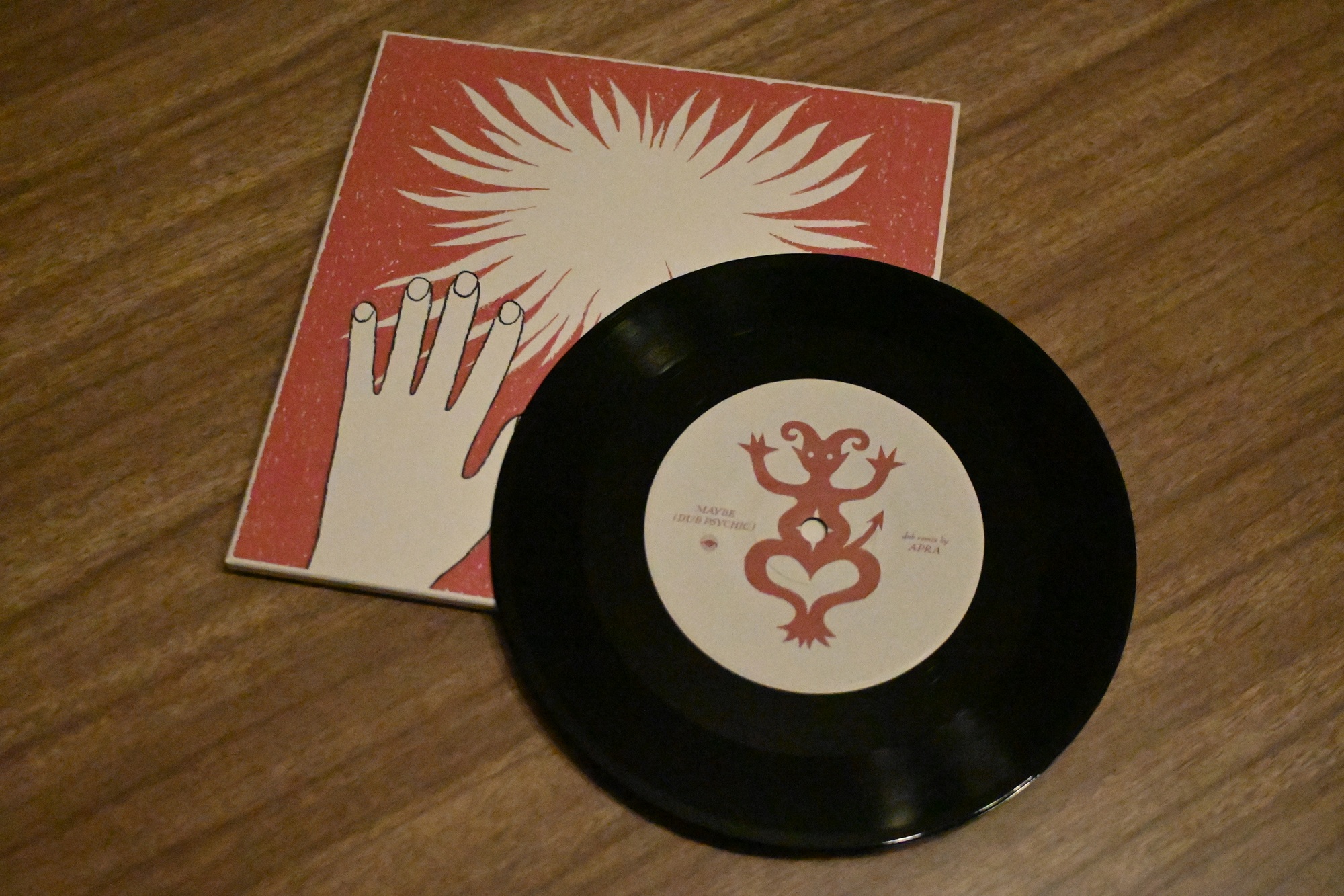 『Maybe Phychic』のレコードと歌詞カードと、特典絵本(インタビュアー私物)