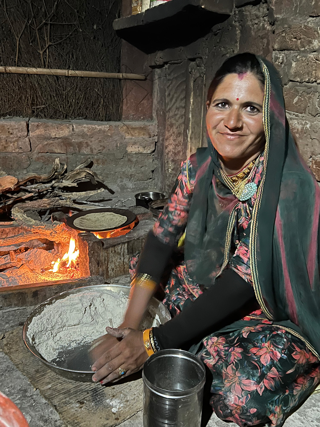 サリーを着たお母さんが地べたに座って作ってくれたのは、アター(全粒粉)のチャパティと、キビ粉のチャパティの二種類。キビ粉のチャパティはもそもそとした独特の質感があり、生地に小麦粉のような伸縮性がないので成形するのにコツが要ります。これを薪火に当ててこんがり香ばしく焼き、熱々を手でちぎって、ギー(発酵すましバター)と荒削りのジャガリー(黒糖)で和えたものをデザートとしていただきました。ギーは、クミン農家の牛小屋にいる牛の乳を搾り、手作りしたフレッシュなものです。