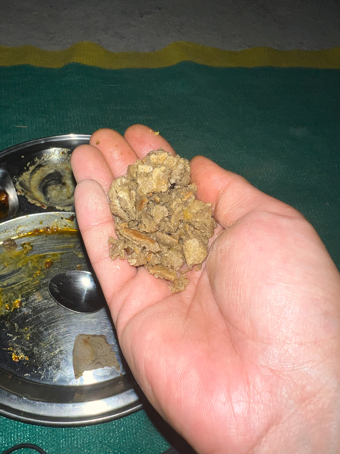 たっぷりのギーを吸い込んだキビ粉のチャパティは、バターが染みたイギリスのクランペット(パンケーキ)のようでもあり、クグロフやシュトーレンの焼きっ面のようでもあります。ジャガリーの粒が舌に当たるとホロホロと崩れ、溶けていくとともに花の蜜のような華やかな香りを放つ。チャパティとギーとジャガリー。たった三つの材料で作るごくシンプルなデザートが、こんなにも心に響くとは思ってもみませんでした。