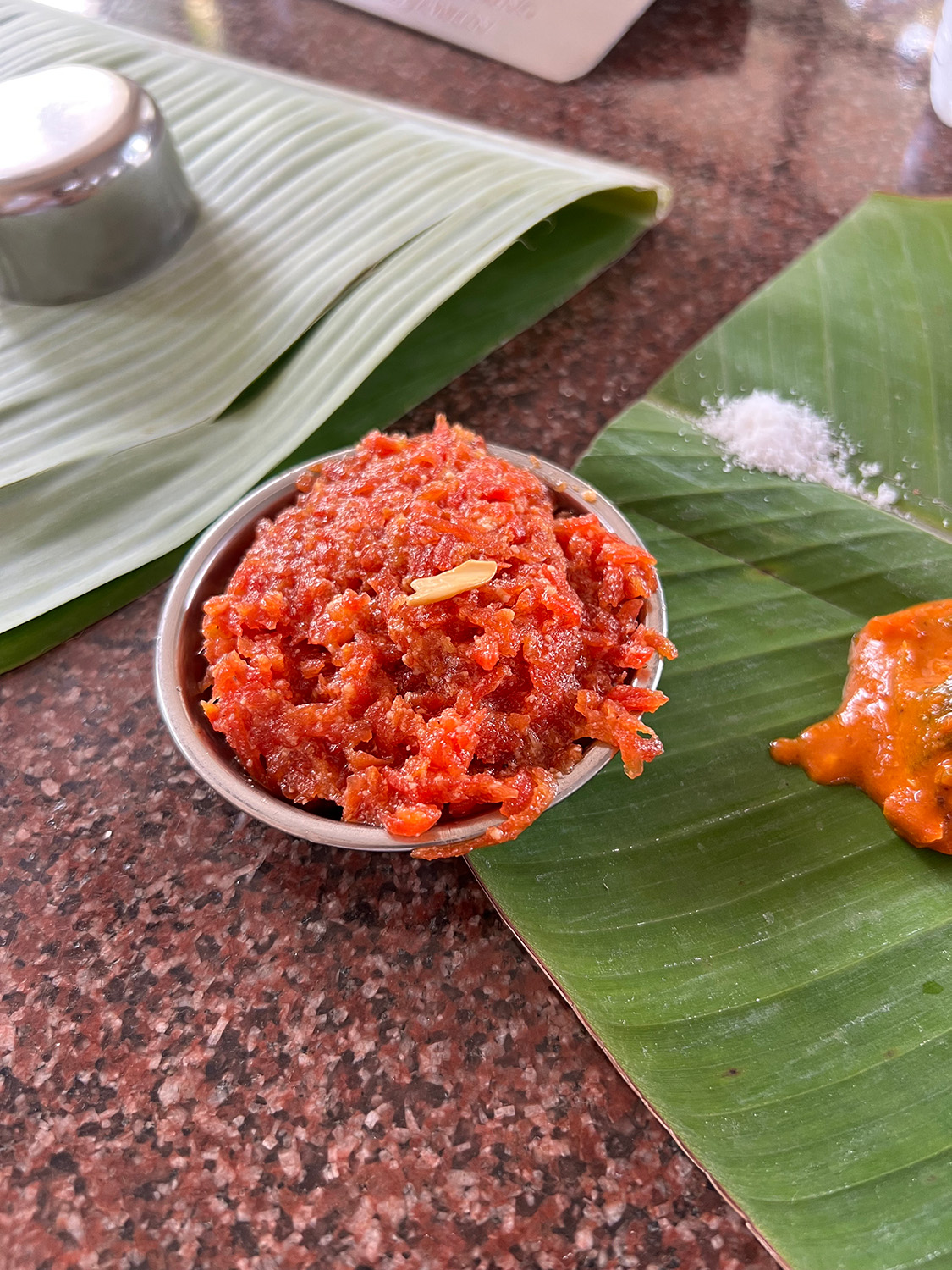 が、怒りを翌日まで持ち越さないのがアミのえみ。小ざっぱりとした頼れるリーダーであります。気を取り直して、旅の締めくくりに南インド料理の食堂へ行くと、なんとそこには人参のハルワがオンメニューしているじゃありませんか!