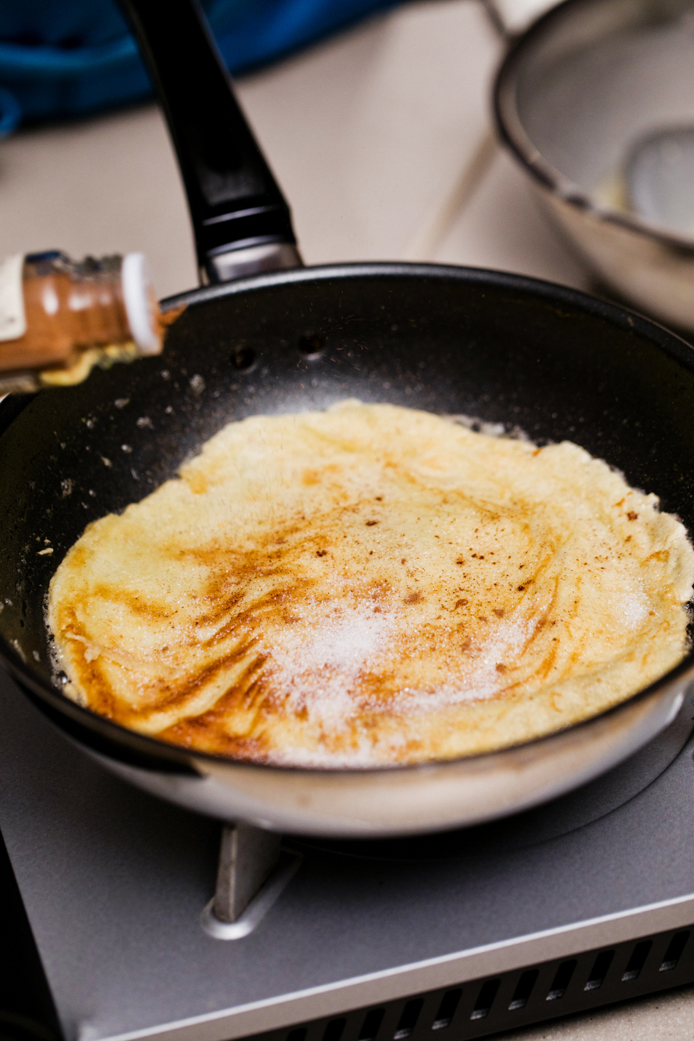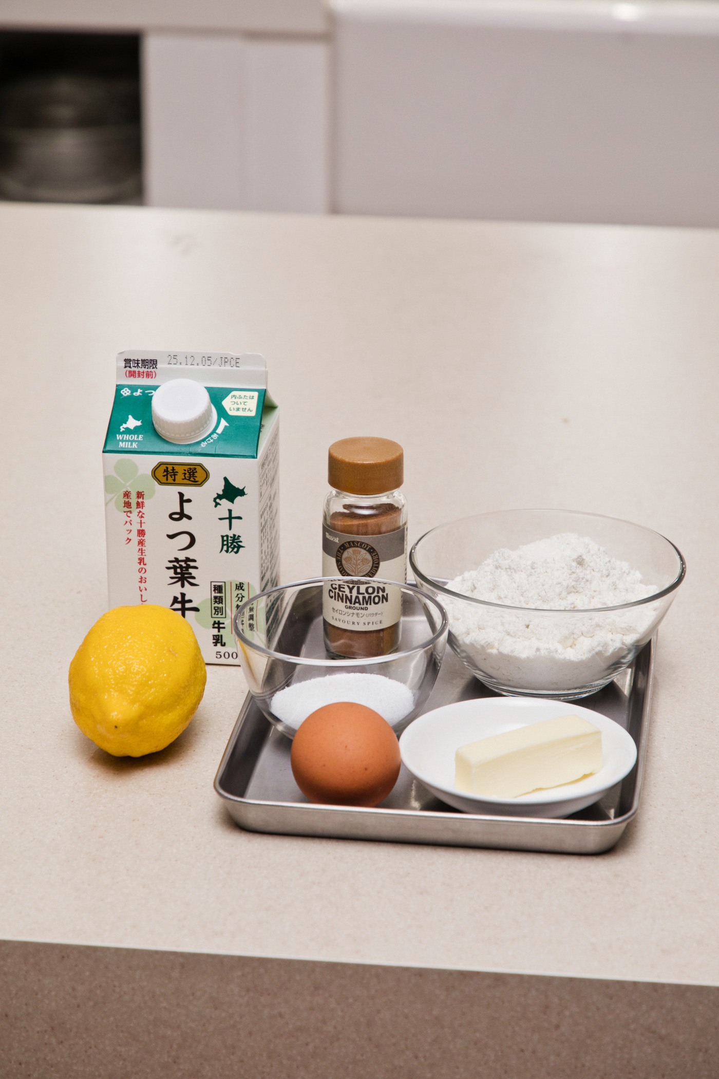 材料は、小麦粉100g、卵1個、牛乳、砂糖30g、バター20〜25g、シナモン、グラニュー糖、レモン。直径24cmのフライパンで4枚ほど焼くことができる。