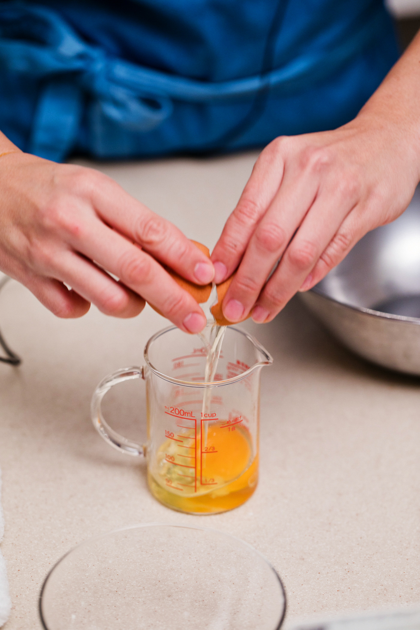 計量カップに卵を割る。