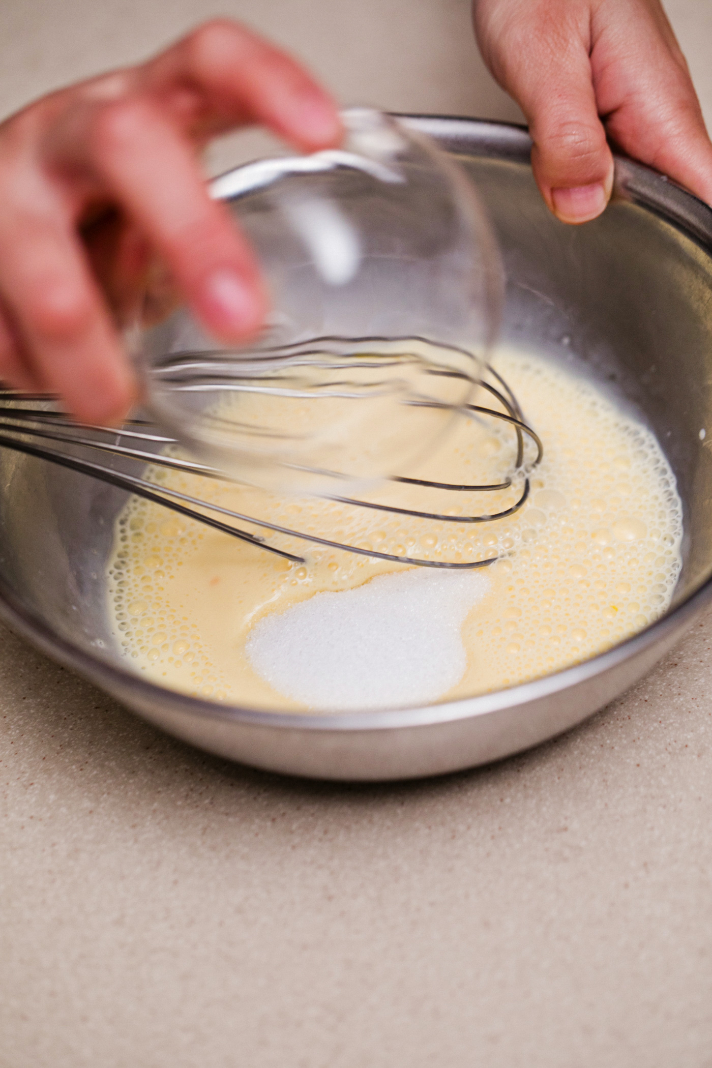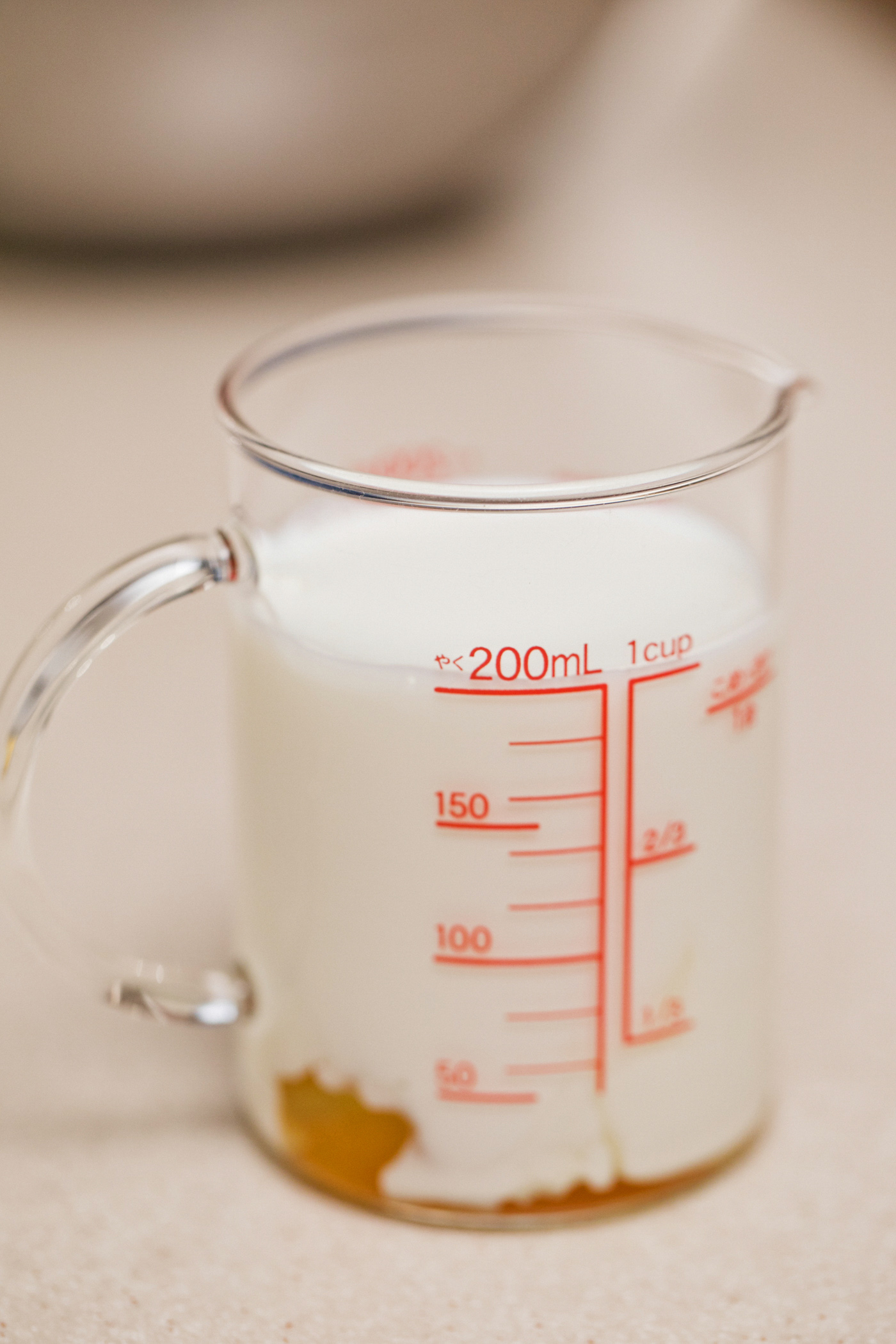 卵を入れた計量カップに牛乳を200mlまで注ぐ。
