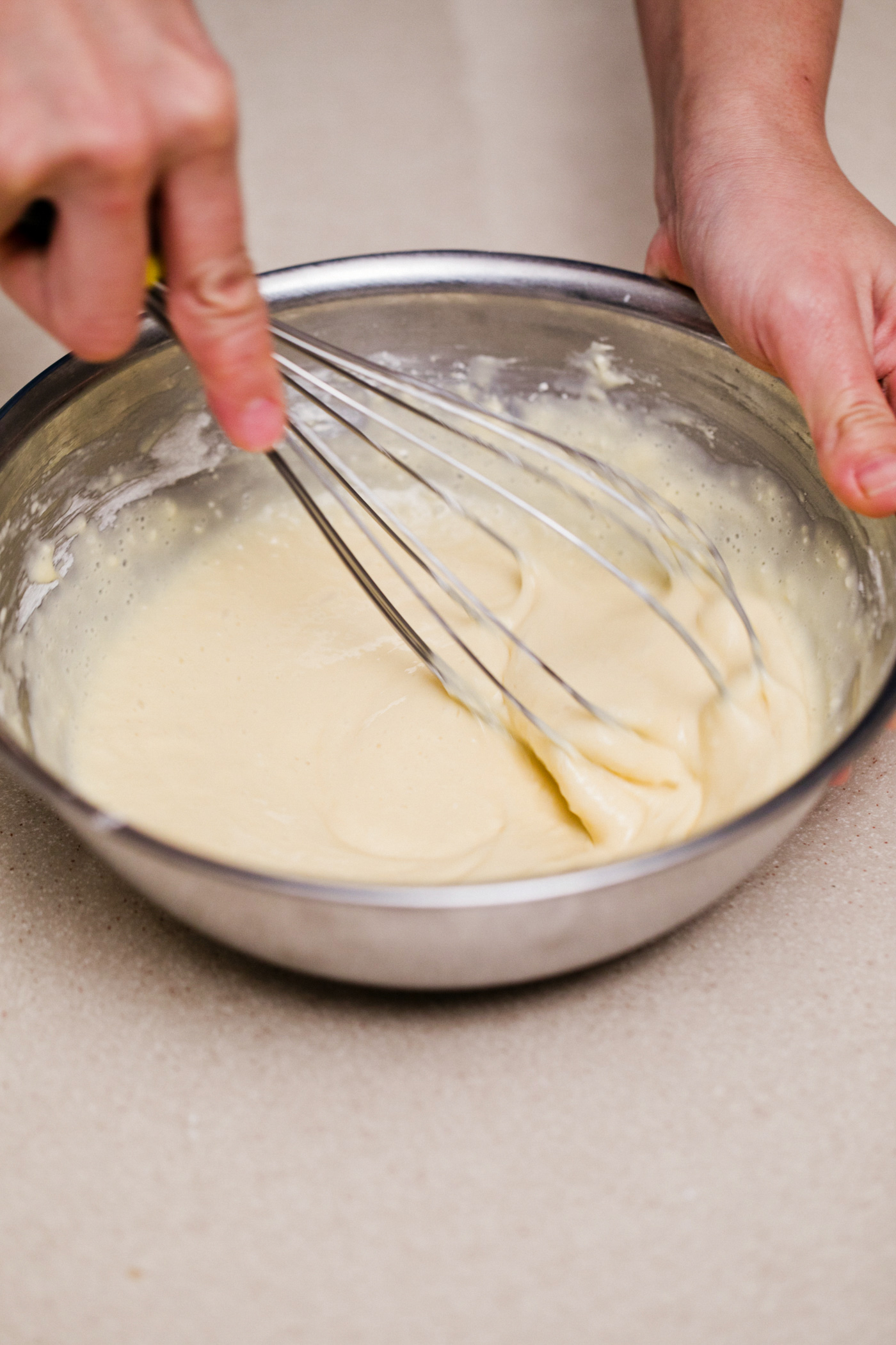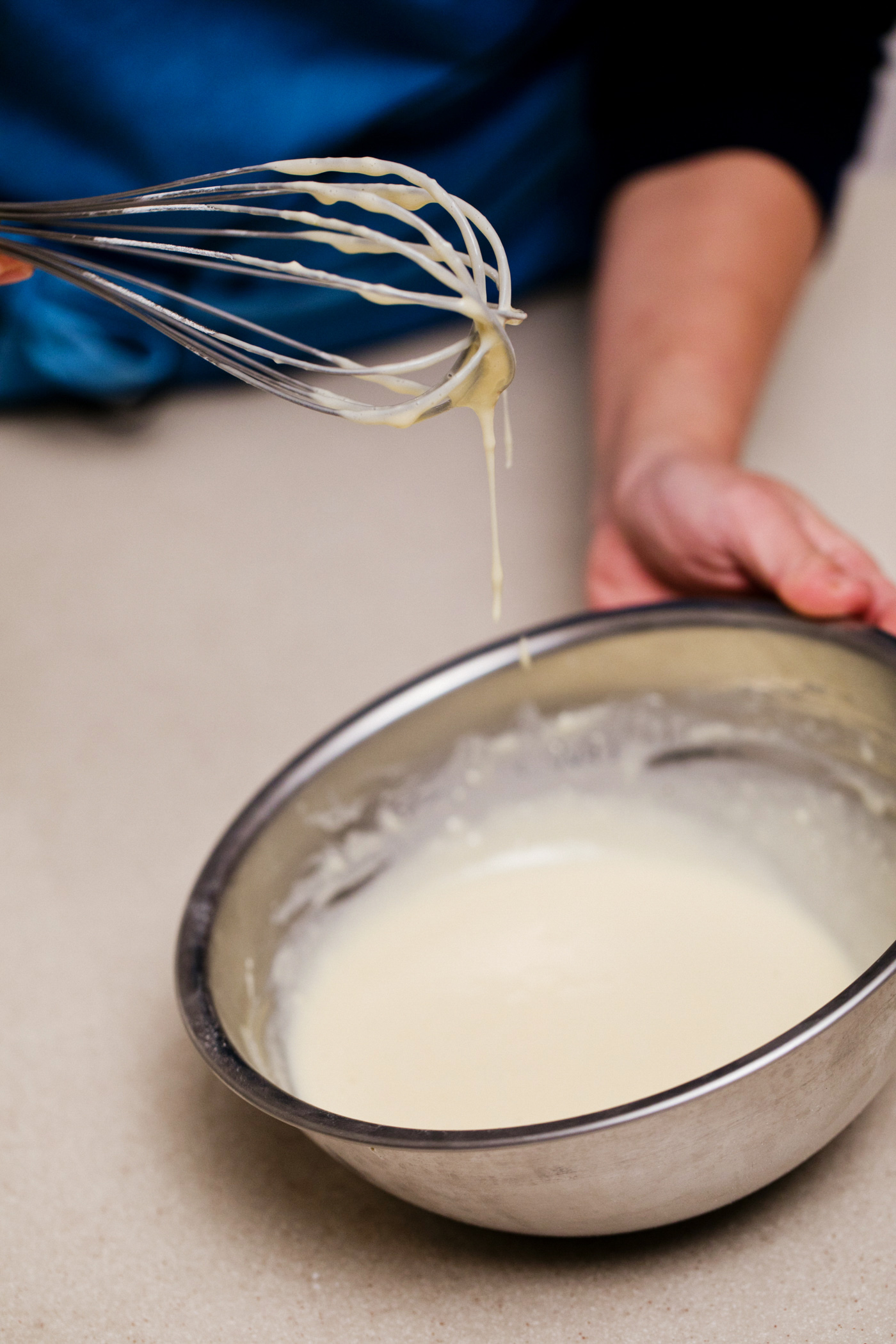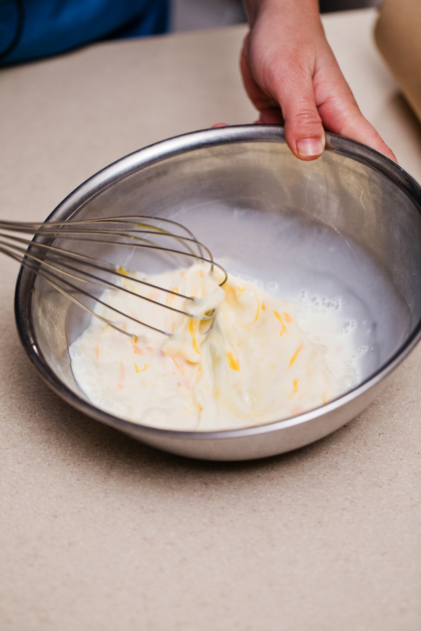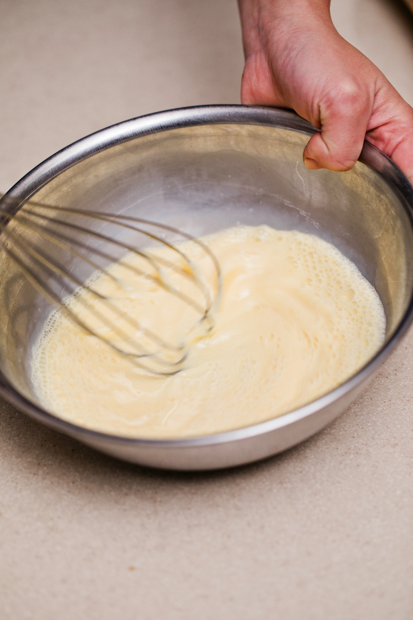 冷蔵庫からボウルを出して、焼く前に底にダマがないかもう一度確認する。