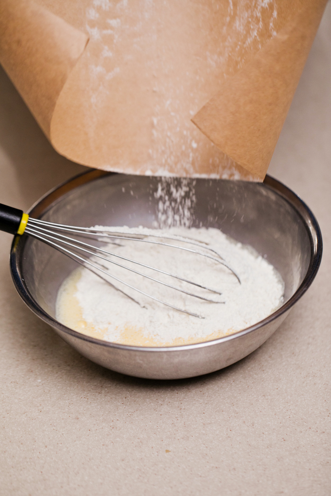 ふるった小麦粉を一気に入れる。