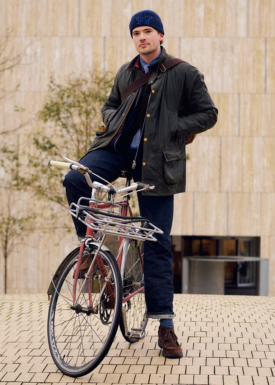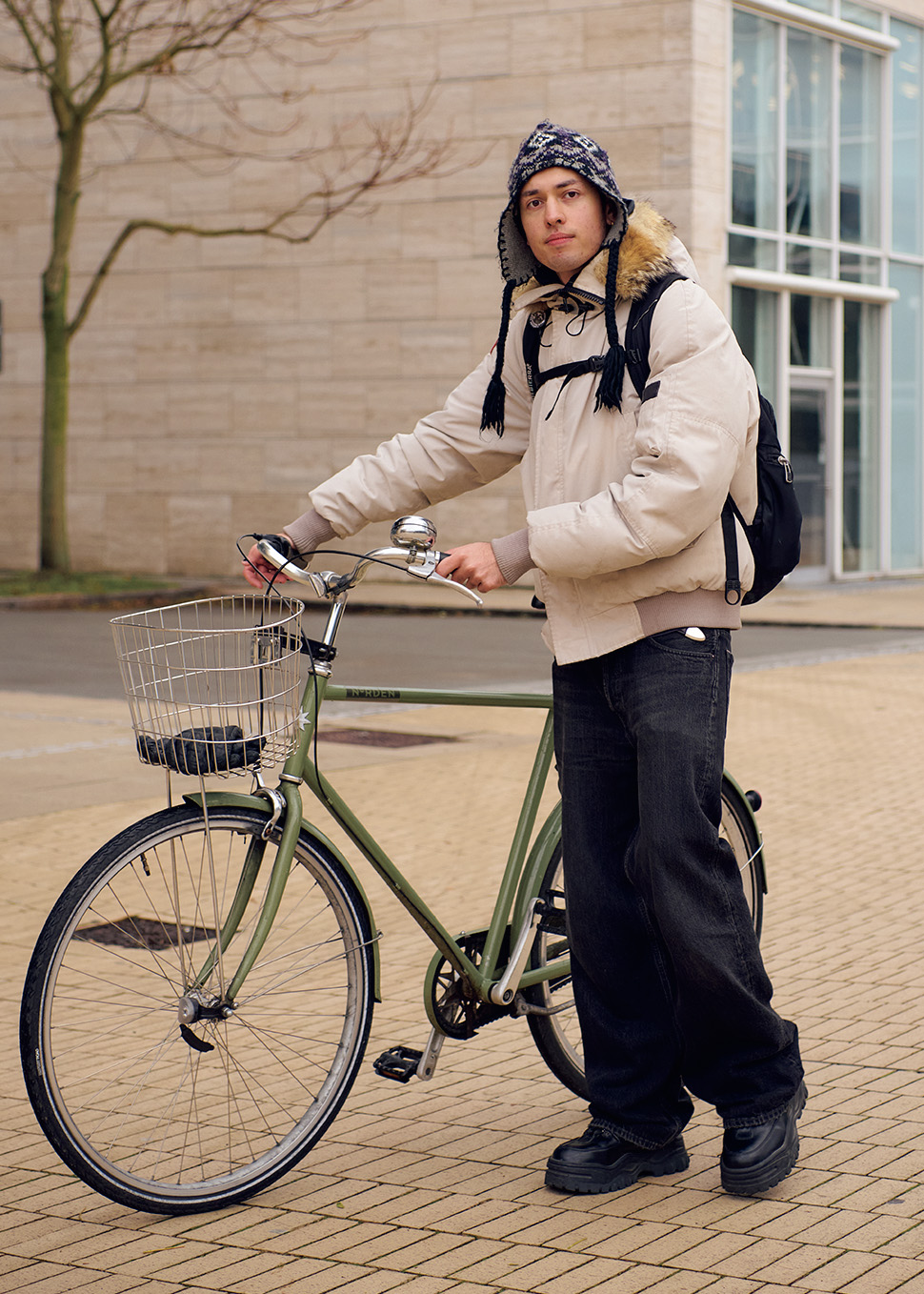 鉄のフレームを使うクラシックな作りが人気の、デンマークの〈Norden〉で走ってきた、言語学専攻のケビン。ニット帽やインナーは古着で、クラスの学生が着なくなった服を交換する「Exchange Day」でゲット。「物価が高くて奨学金だけじゃ暮らせないから貴重な機会なんだ」