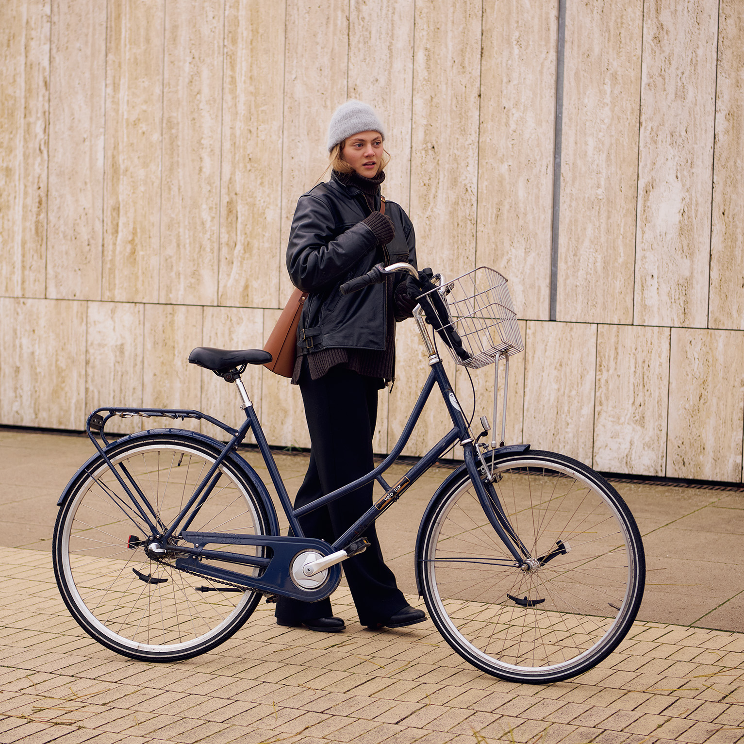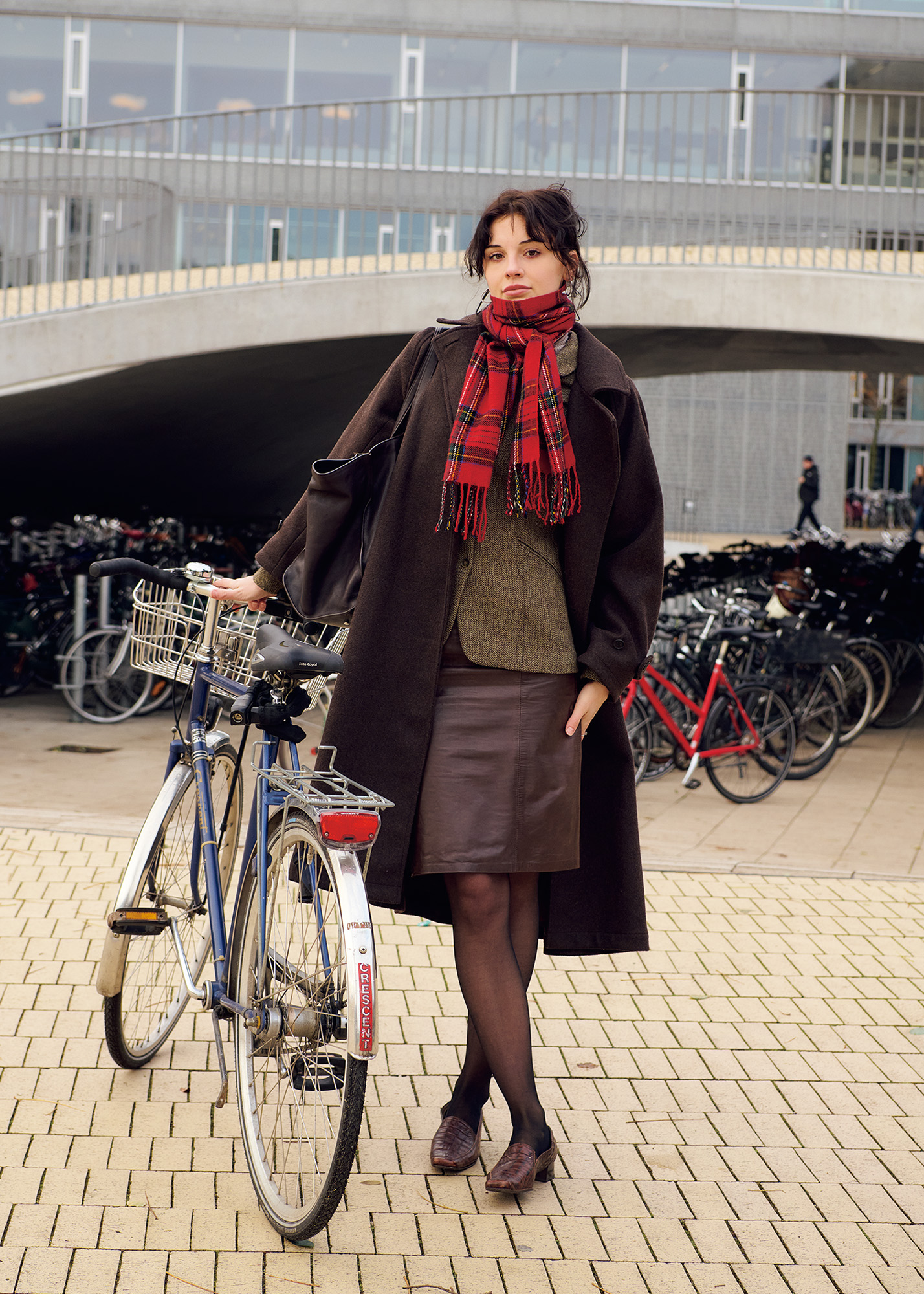 人文学部哲学科のメリーナは母からもらった英国のハンティングJKにお気に入りのスカートで。コペンだとスカートで自転車、ってのは割と普通らしい。「これは1908年創業のスウェーデンの〈Crescent〉。アパートの82歳だった友人が譲ってくれたの。乗ると彼を思い出します。このブランドの昔のスプロケットは特別な仕様で、大切にそのまま使ってます」
