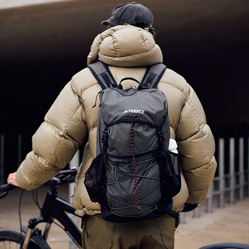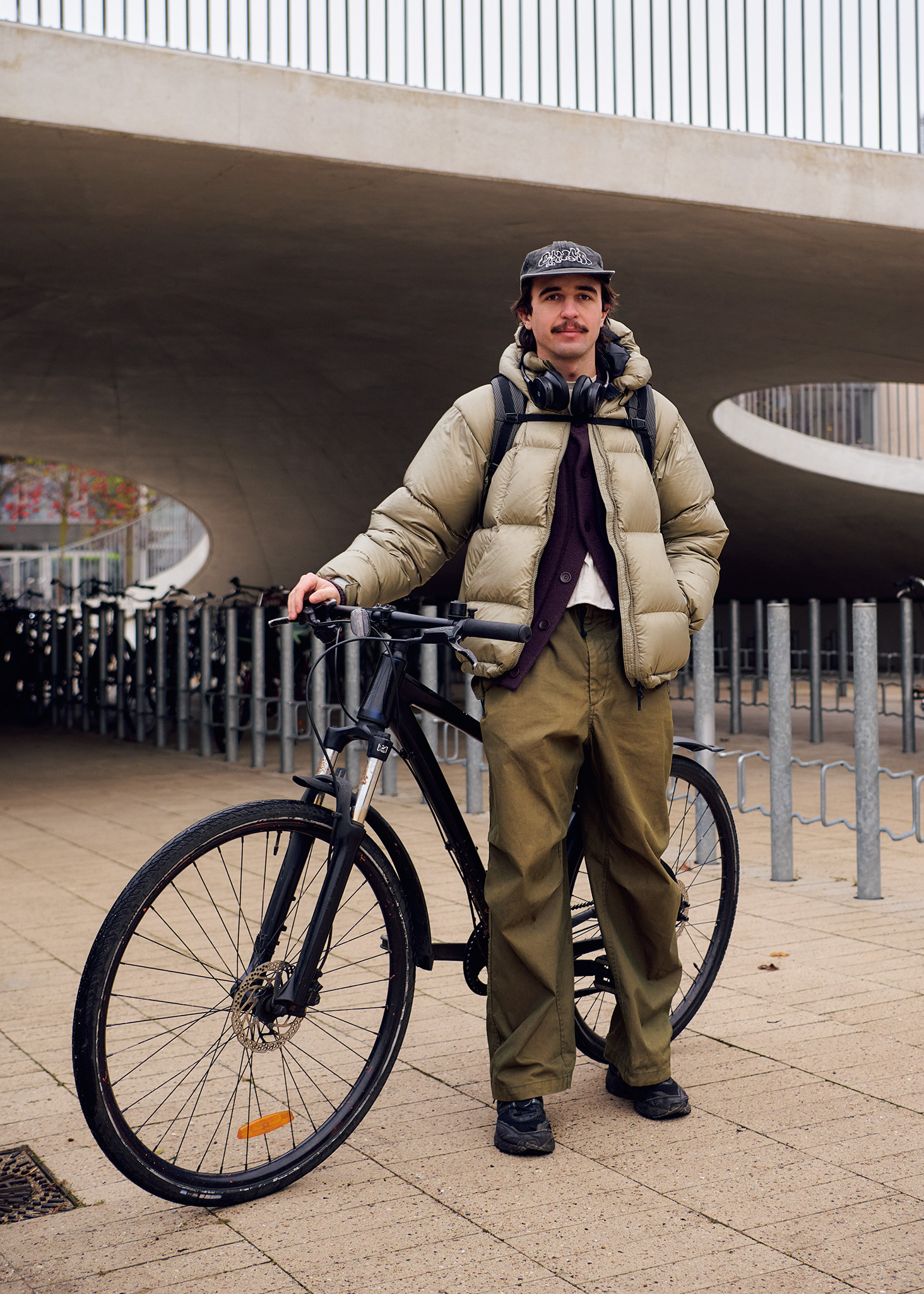 人文学部哲学科のヨーナスは〈アディダス〉所属のプロランナー。授業の後にトレーニングだから服装は機能性重視で、〈ゴールドウイン〉のダウンは軽さとフィット感が好み。「日本発祥の〈Nishiki〉のMTBは、軽量化して、オールブラックに自分で塗装した。めちゃ速いよ」