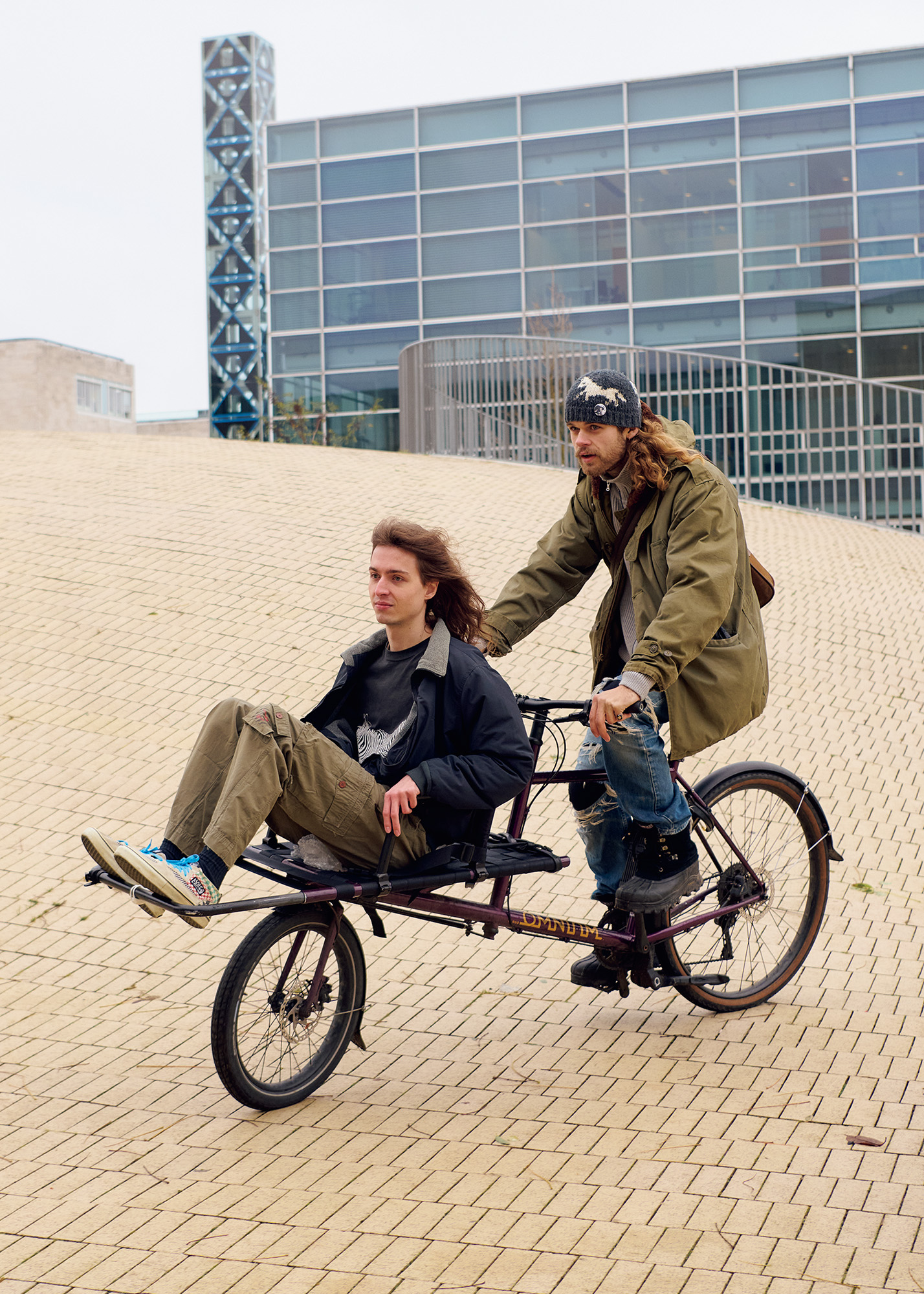 コペンといえば、前部に大きな荷台があるカーゴバイク。3輪が基本だけど、デンマークの〈Omnium〉はクールな2輪のモデルが多く「憧れです」と建築学部のビクター(右)。『Vintage by Grau』という古着屋もやっていて、実はフリマに出店するときに友達に借りるヤツなんだって。「荷台に乗るのが好き」という近所のクリスチャン(左)を連れて登校。