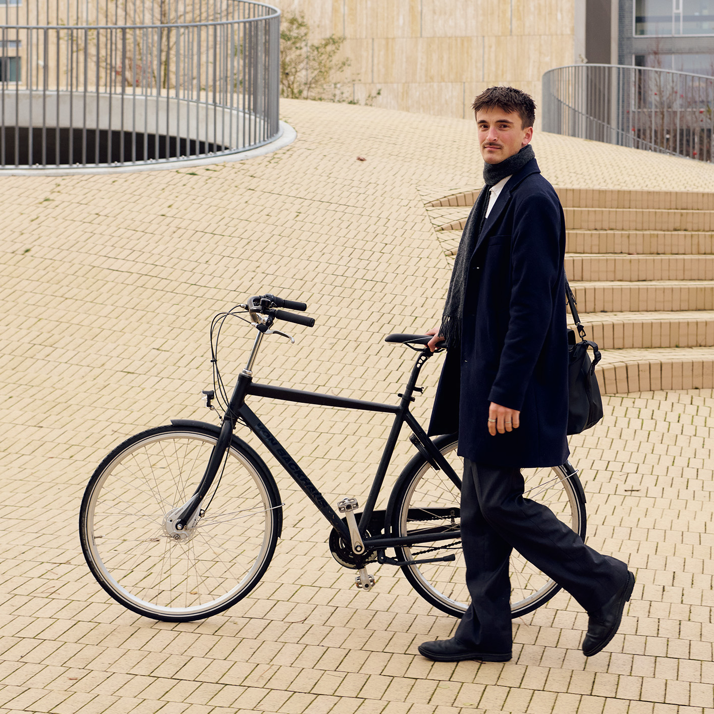 職場近くの自転車整備士から買ったというオスカーの自転車は〈Von Backhaus〉。普段使いのシンプルなシティバイクがポピュラーな地元のブランドだ。今日は姉とランチだから、姉からもらったギリシャ発祥の〈ベルト ルッチ〉のセーターに、父がくれたパンツを合わせて。