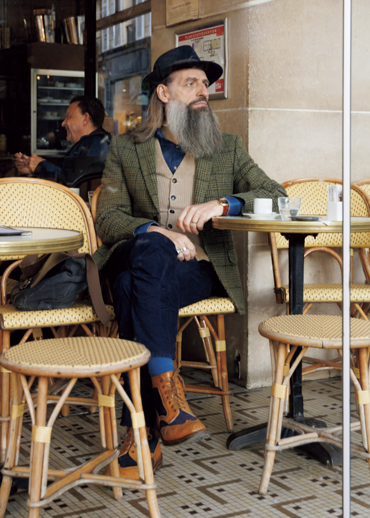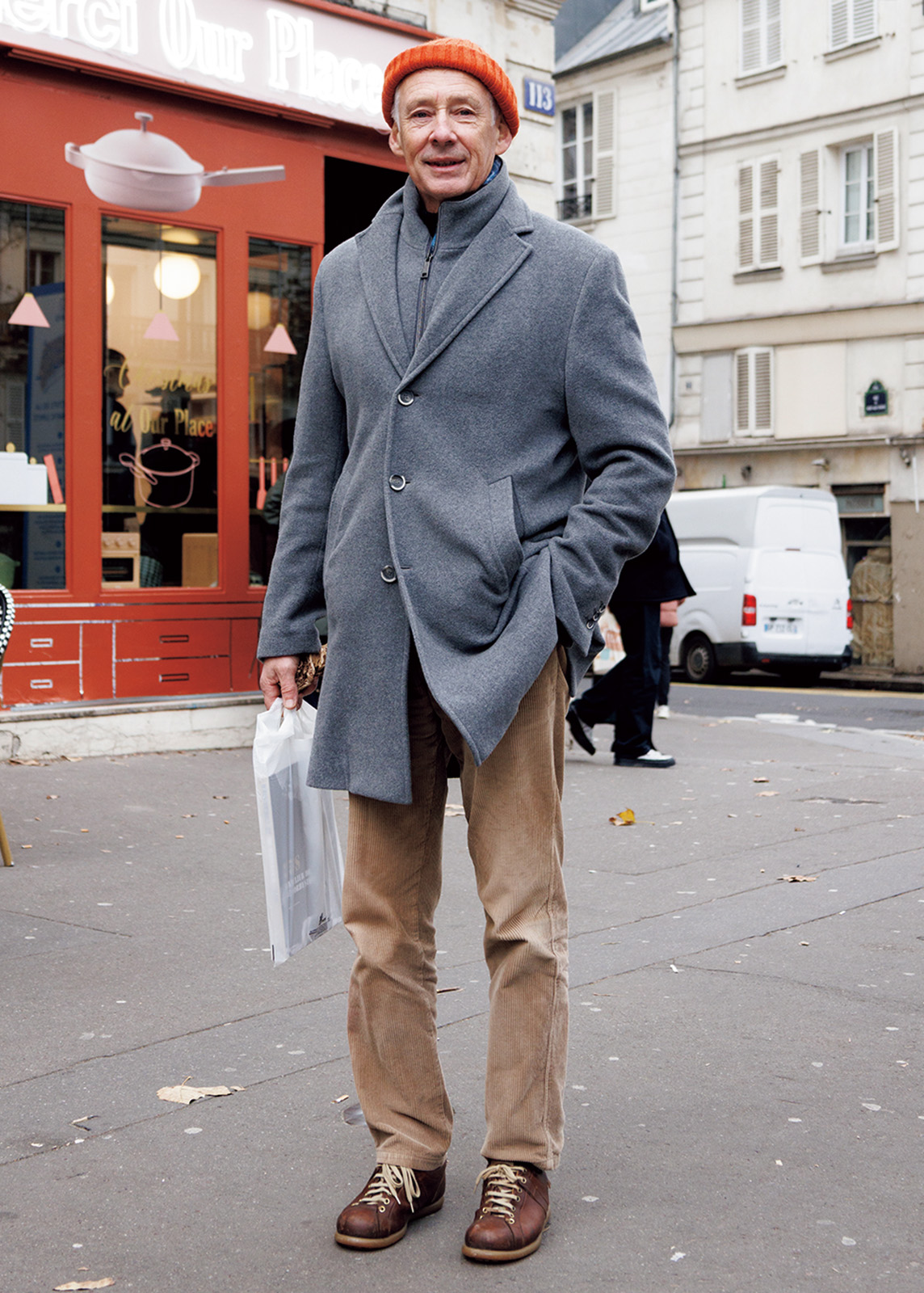 ドイツの〈ストーンズ〉のコートと似た素材と色の服をレイヤードした着こなしがシックなミッシェル。「パリのイケオジって俺みたいに帽子をかぶってるでしょ。〈フルードバーニュ〉ってブルターニュのブランドだけど、知ってる?」