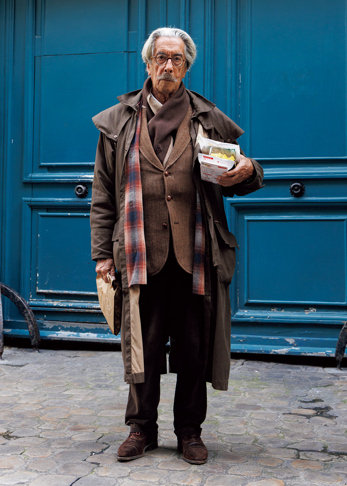 まるでウェス・アンダーソンの映画に出てきそうな彼は、スーパー帰り。「俺のレイヤードが素敵だから撮るって? お洒落をしているつもりはないし、レイヤリングに限界なんてない。何枚でも気が済むまで重ねればいいんだ」