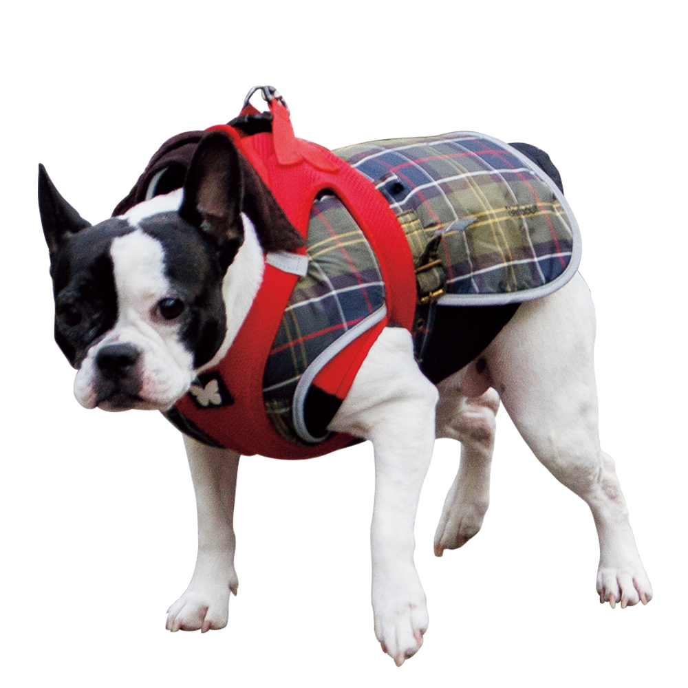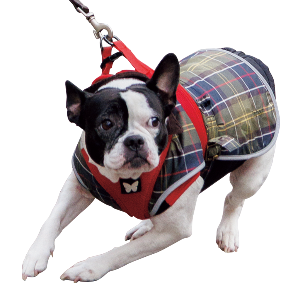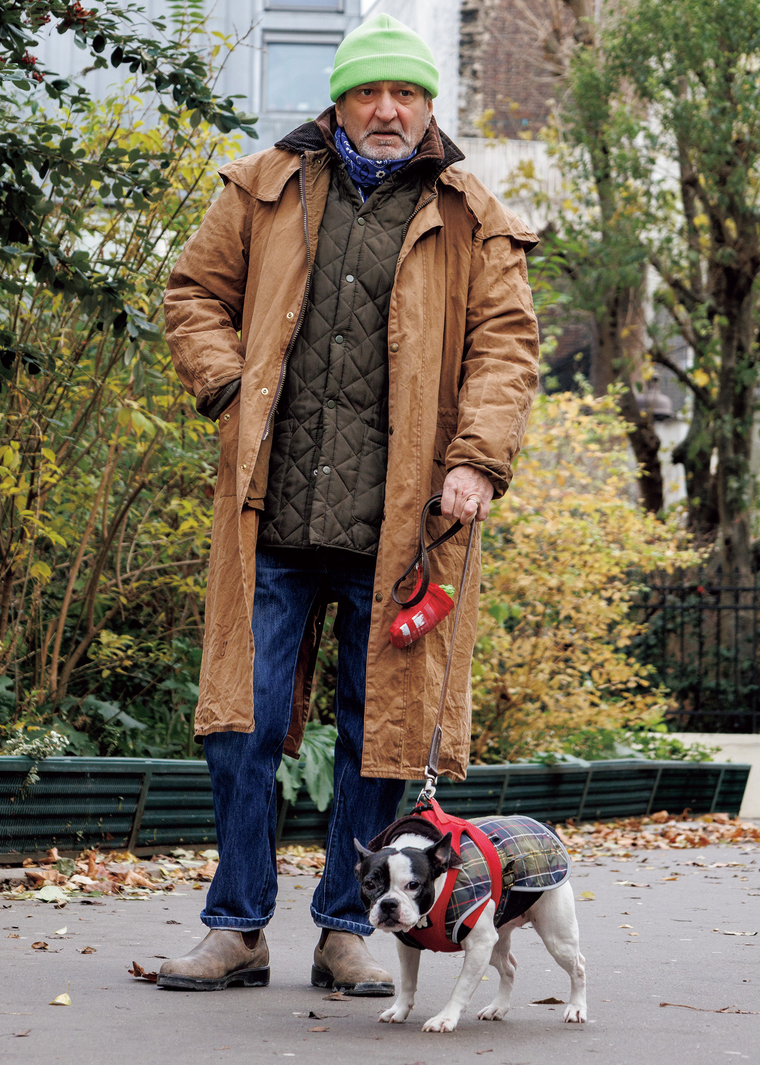喉を痛めると必ず風邪をひくので、夏でも冬でも首にスカーフを巻いているというドム。「愛犬のコートは、俺がインナーに着てるジャケットとお揃いの〈バブアー〉。最近こいつに似てきたね。毎日散歩させられてるんだ。寒さなんてお構いなしだよ」