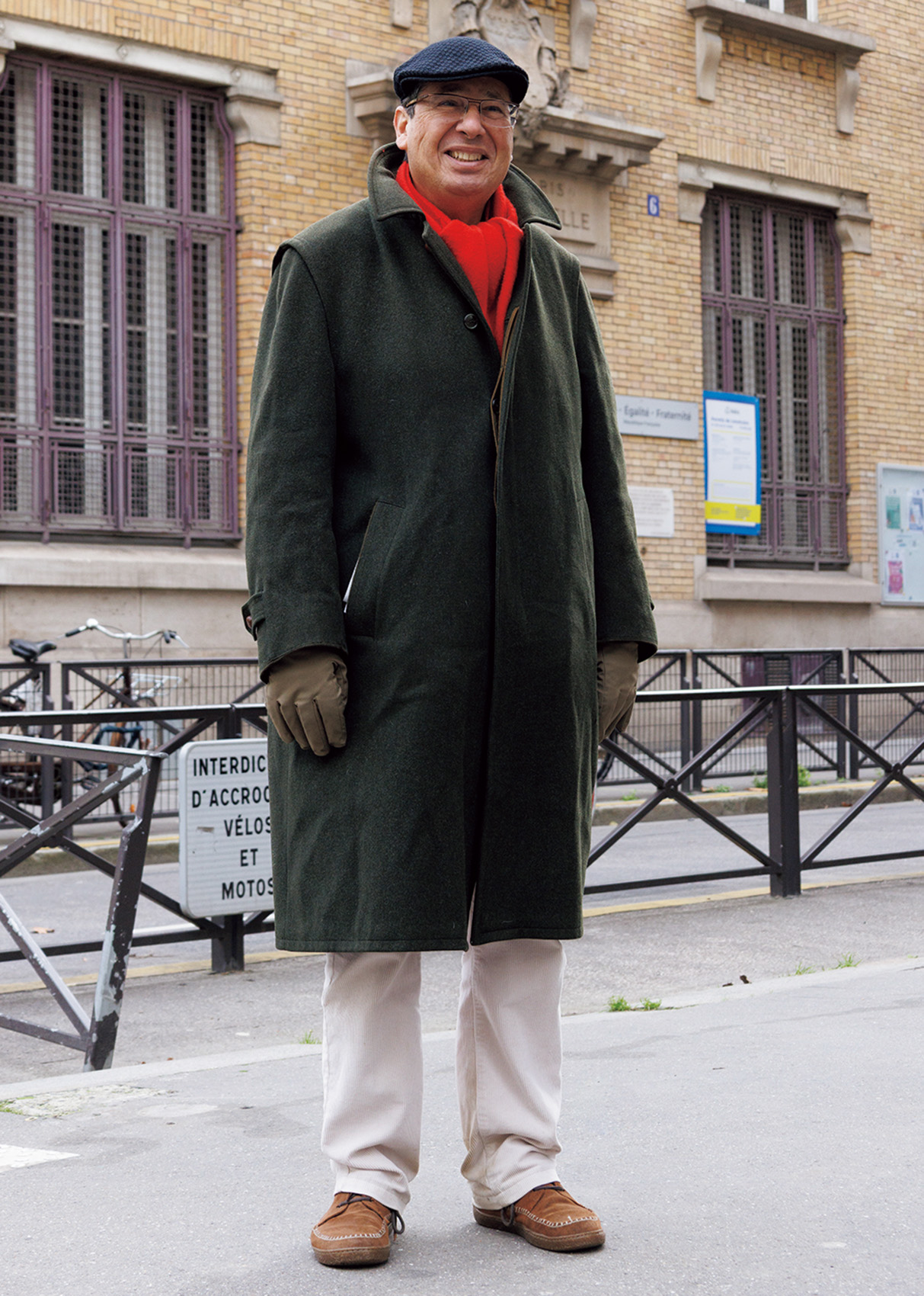 Aラインが綺麗なローデンコートを着て散歩中のサルファティ。「アウターよりも首元を見てほしい。マフラーのパキッとした赤がいいよね。この手のものの素材はカシミヤに限る。え、日本の雑誌の撮影? 今、日本語の勉強中だよ」