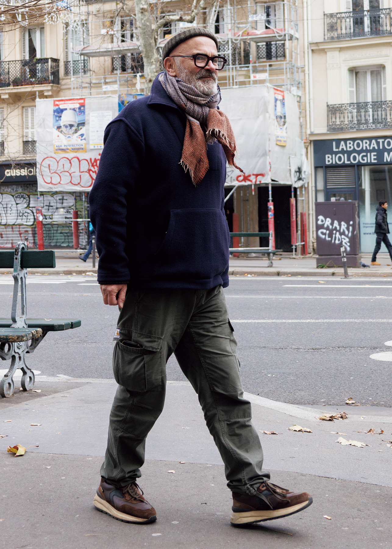 〈カーハート〉のパンツのカーゴポケットに、スマホなどをパンパンに入れて歩くクリストフ。「いつも手ぶらだし、服は動きやすさが一番。〈アルモーリュクス〉のフリースジャケットも、アウターとして使えるくらい暖かい上に軽くて楽なんだ」