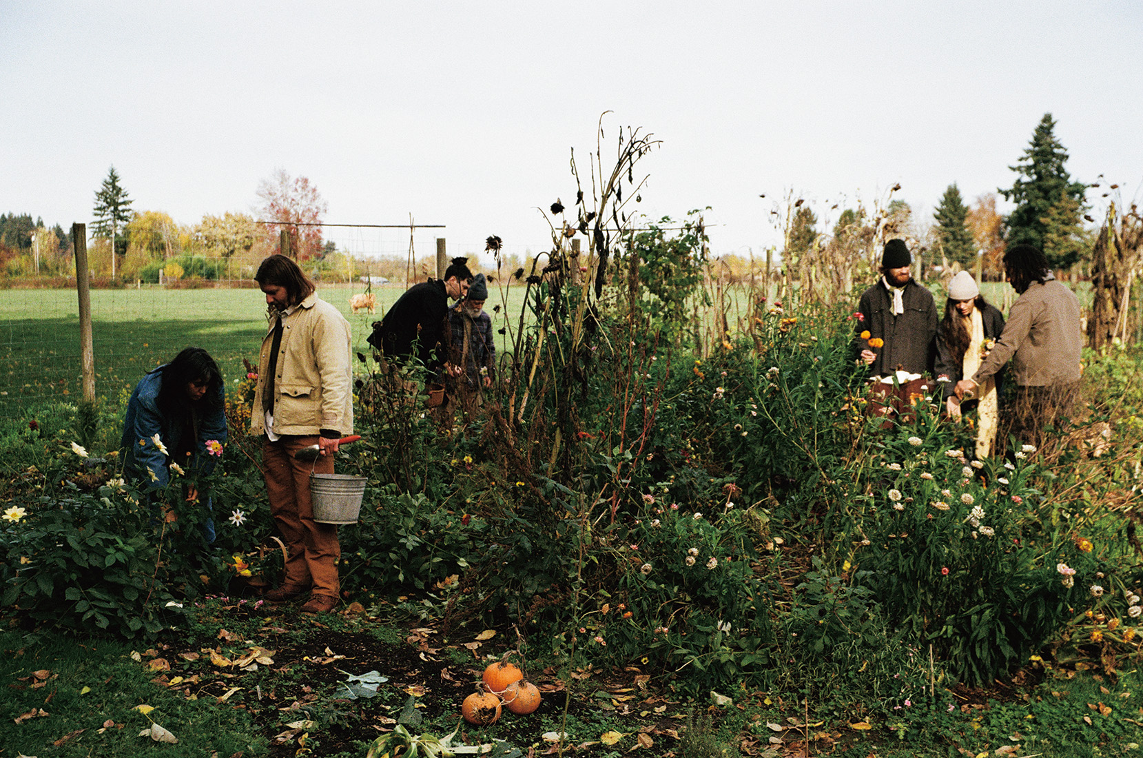 30種以上の野菜や花が育てられ、1年目のおわりを迎える〈マイルス レオン〉のガーデン。仲間たちとパンプキンやビーツ、豆、最後の生花の収穫をしながら、来季の構想中。畑の野菜や果物はコンポストや牛の餌としても活用されている。