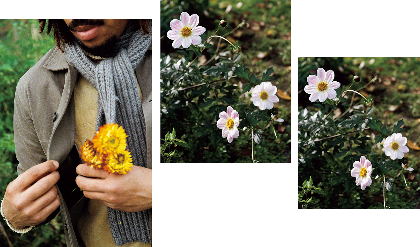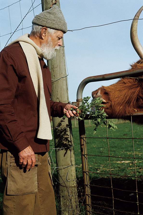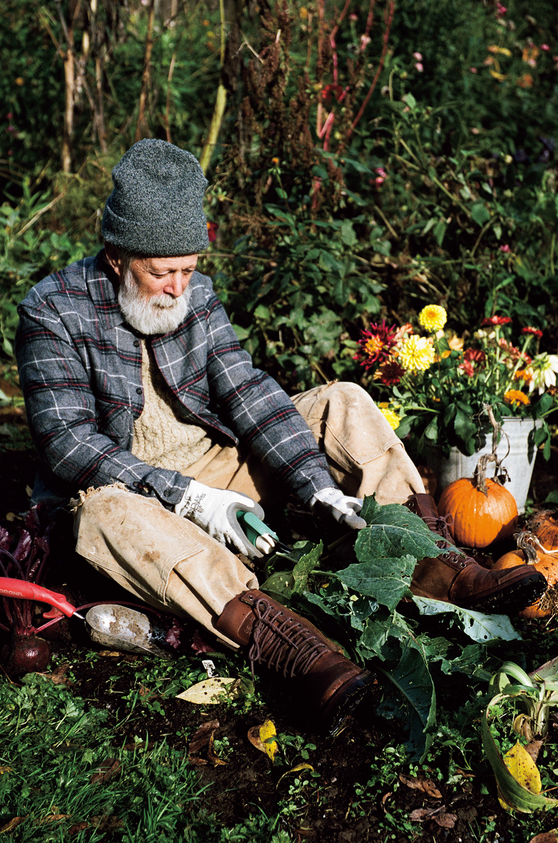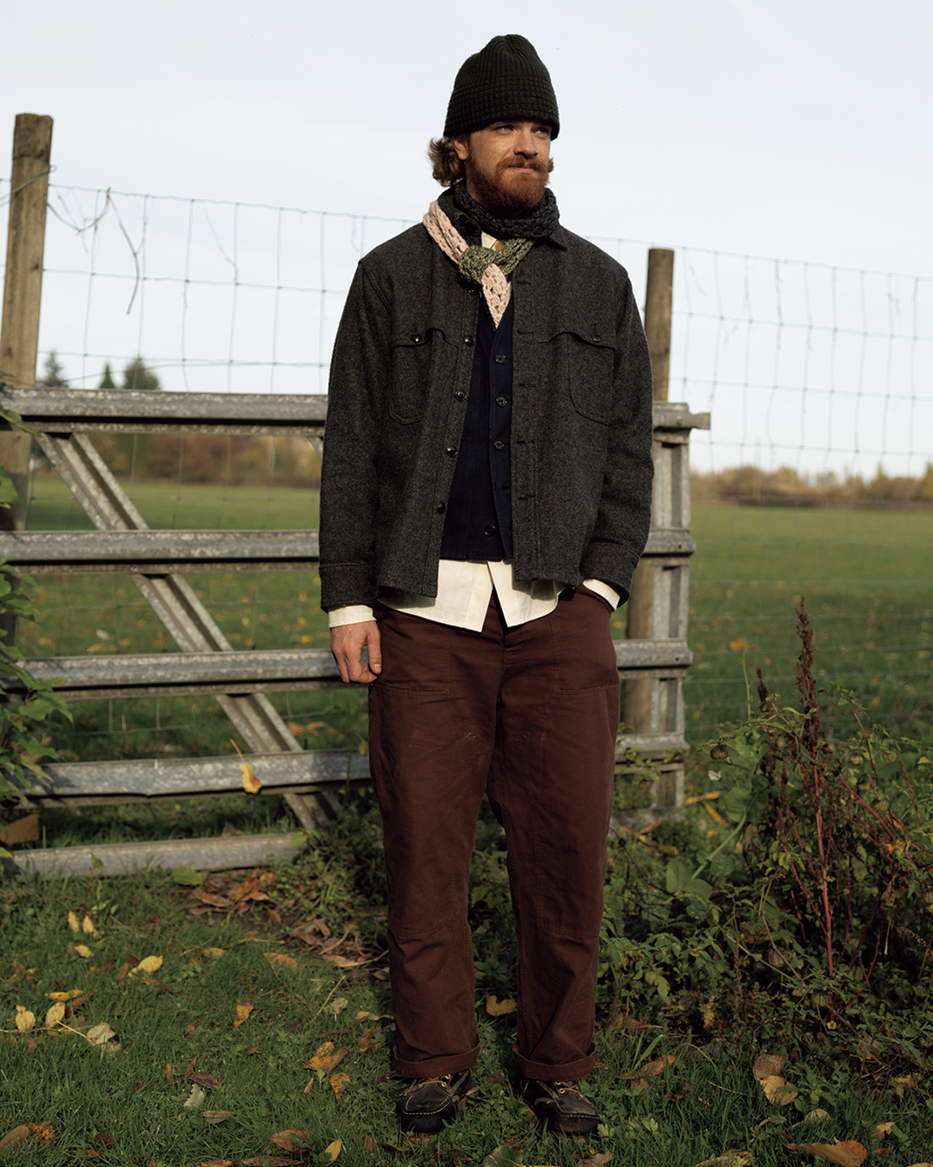 フラワーファームを主宰するローガンの旦那さん、ジェームス。「庭仕事は妻のかたわらで、待つこと、コントロールしないことを学んでいるよ」。〈マイルス レオン〉のダブルニーのコットンキャンバスパンツはタフでポケットが多く、庭仕事の制服に。マフラーはローガンのお手製。