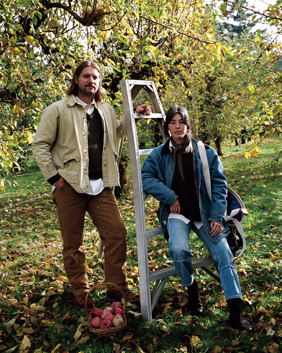 自然発酵のハードサイダーブランド「Little × Litte」を主宰して4年目のダニエルとエイミー。それぞれシェフ、アーティストとしての才能を生かし、エイミーがデザインを手掛け、ダニエルはサイダーに合わせたフードのポップアップ等も行う。エイミーが肩から掛けているのは収穫専用の巨大なバッグ。デニムonデニムの差し色には〈マイルス レオン〉の白シャツでダニエルとお揃い。「乾きやすいコットンリネンなので、季節を通して作業用に愛用しているよ」。刺繍が得意なエイミーは自分のパンツやダニエルの穴が開いたニットに独自のダーニングを施す。ふたりとも手をかけて着るほどに味が出る丈夫な自然素材を好む。