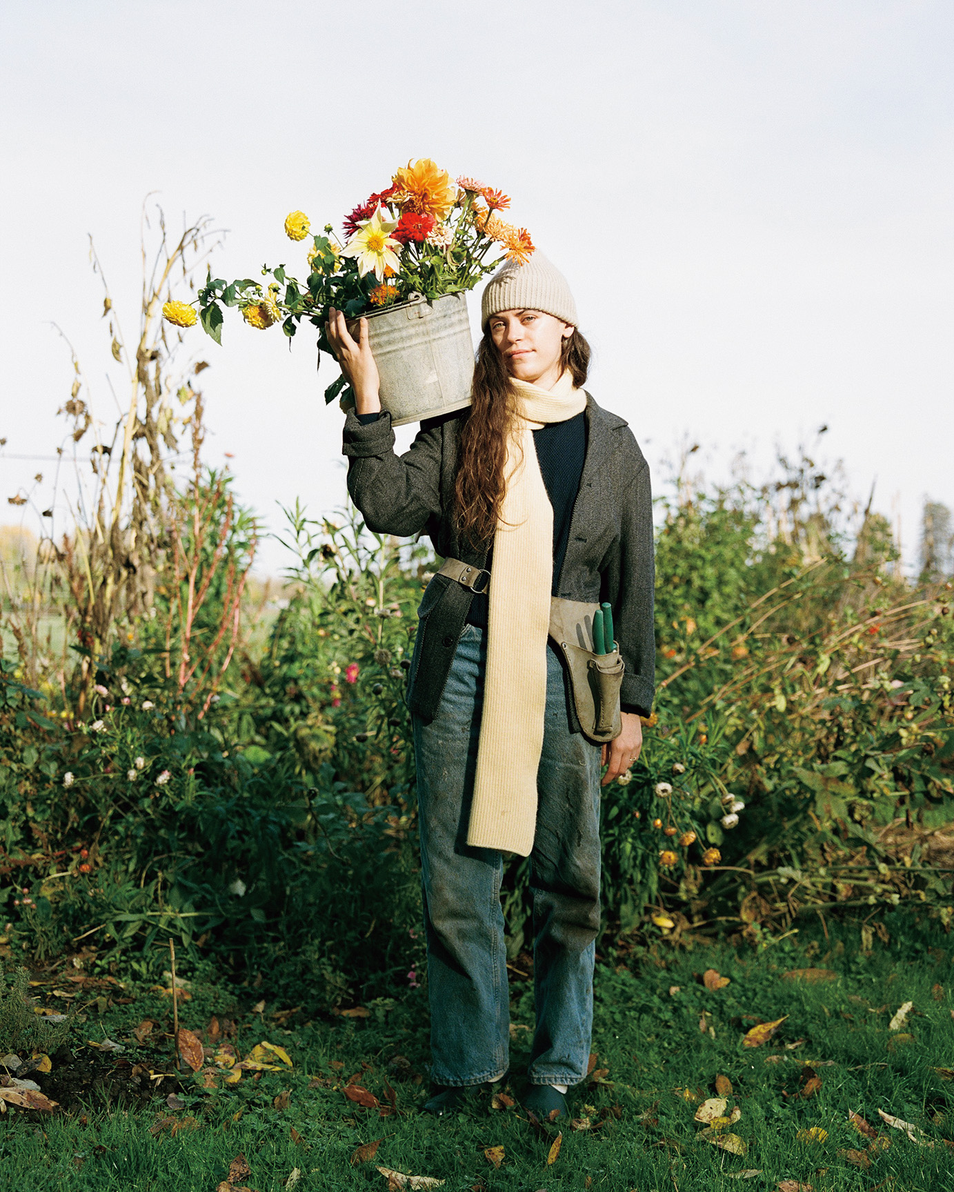 夫のジェームスと共有するジャケットの上に重ねた革のツールベルトは、ノースカロライナの小さな工房でハンドクラフトされているもの。「おかげで工具をポケットに入れて穴が開くことがなくなったわ」。自分たちの結婚式用に花を育てたのをきっかけに学び直し「Best Friend Flower Farm」を始動!