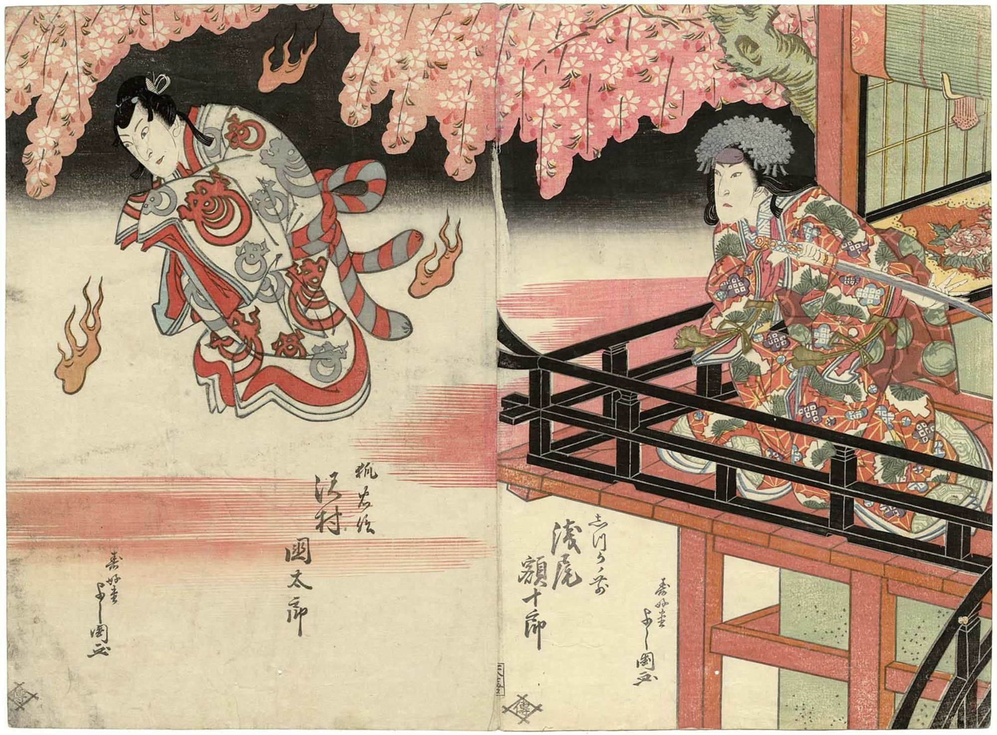 『義経千本桜』の「河連法眼館」、左から二代目澤村國太郞の狐忠信(源九郎狐)、初代淺尾額十郞のしづかノ前。文政8年(1825年)8月