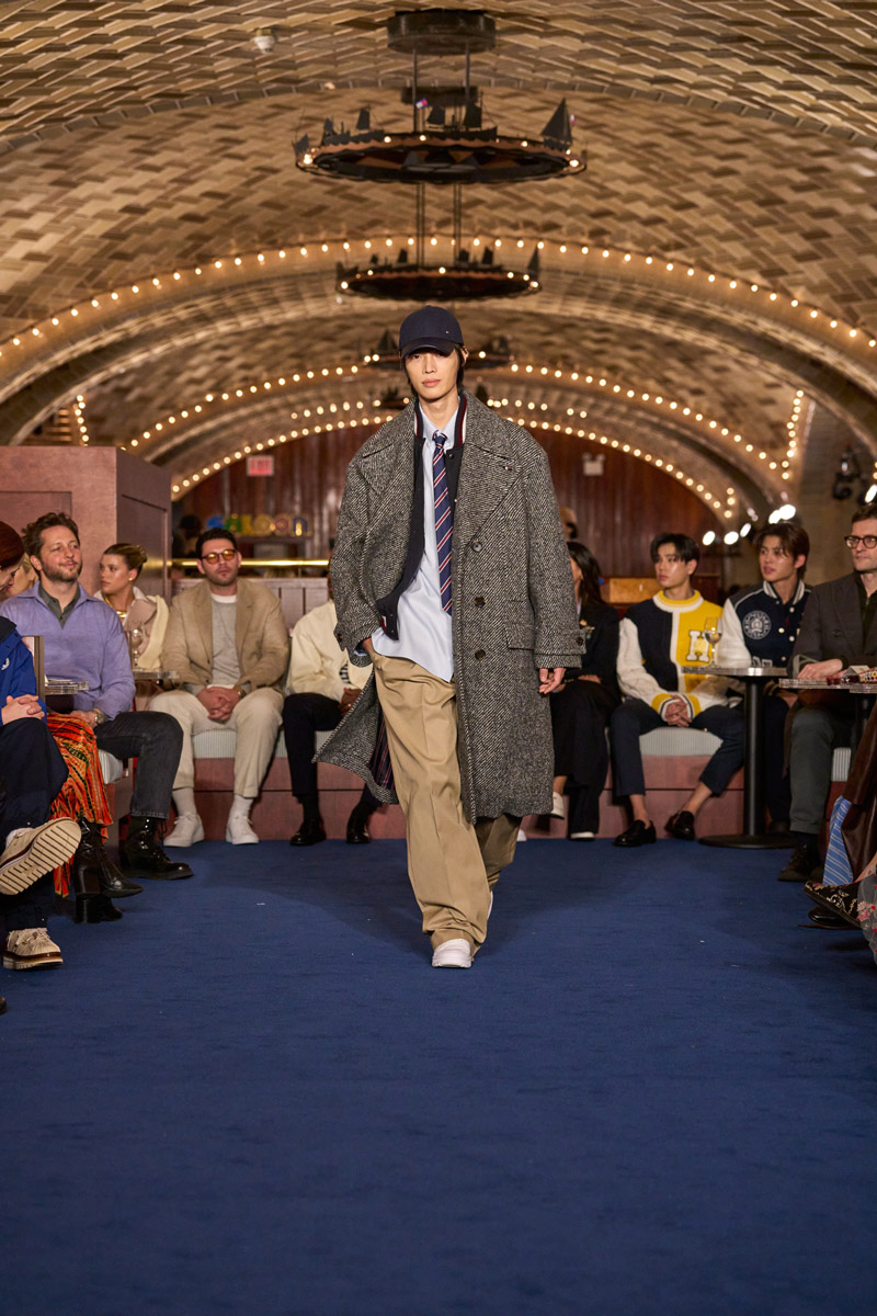 2024年秋冬のコレクションのスタイリングの一つ。グレーのコートやベージュのチノパンというクラシカルなアイテムをベースに、〈トミー ヒルフィガー〉らしいクリーンなオーバーサイズ感が際立つ。