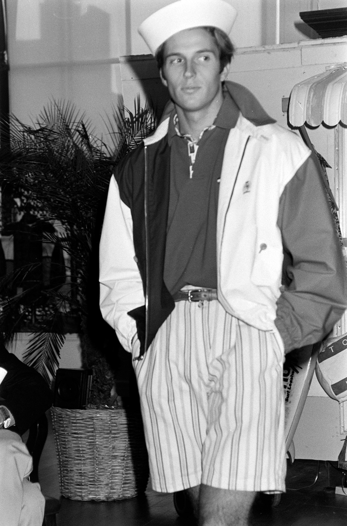ヨットマンの、洒落た休日スタイルといった雰囲気の写真は、1991年春夏のコレクションから。ポロシャツをショーツにタックインして、マルチカラーのセーリングジャケットを羽織る。2026年の春夏に、そのまま真似したいスタイルだ。