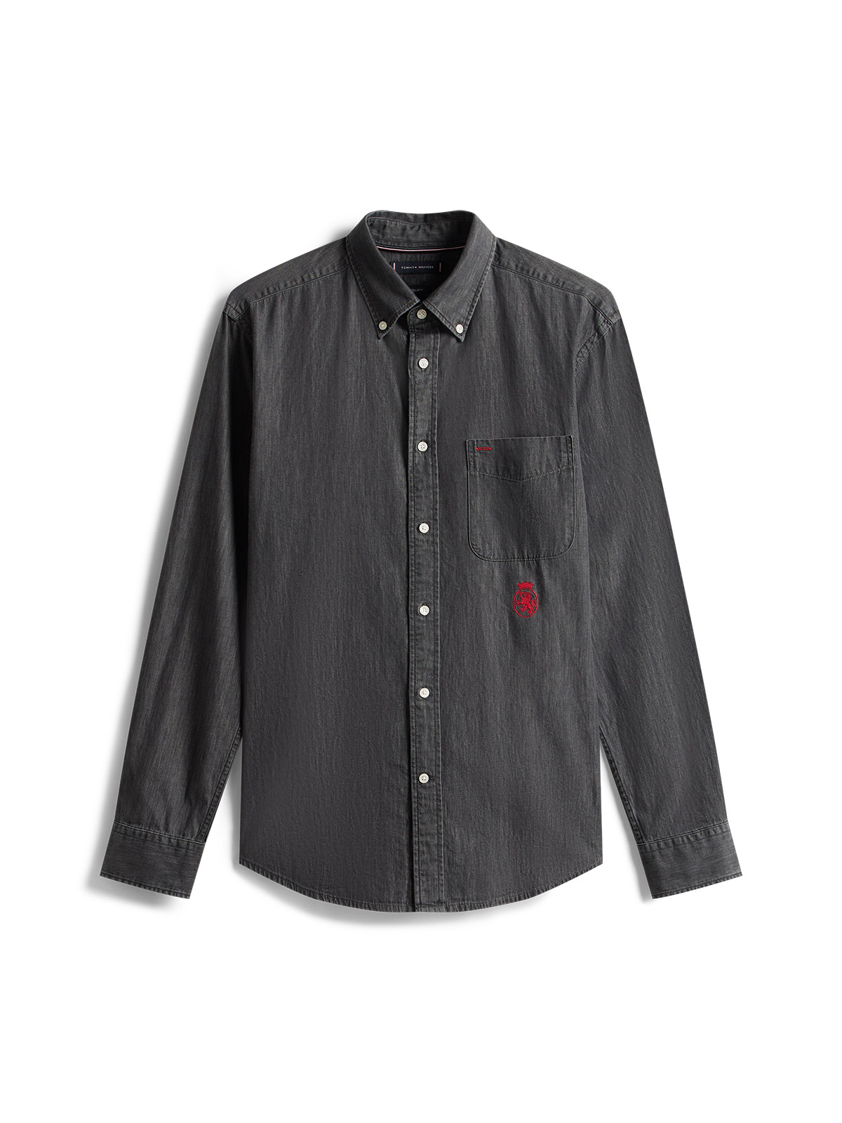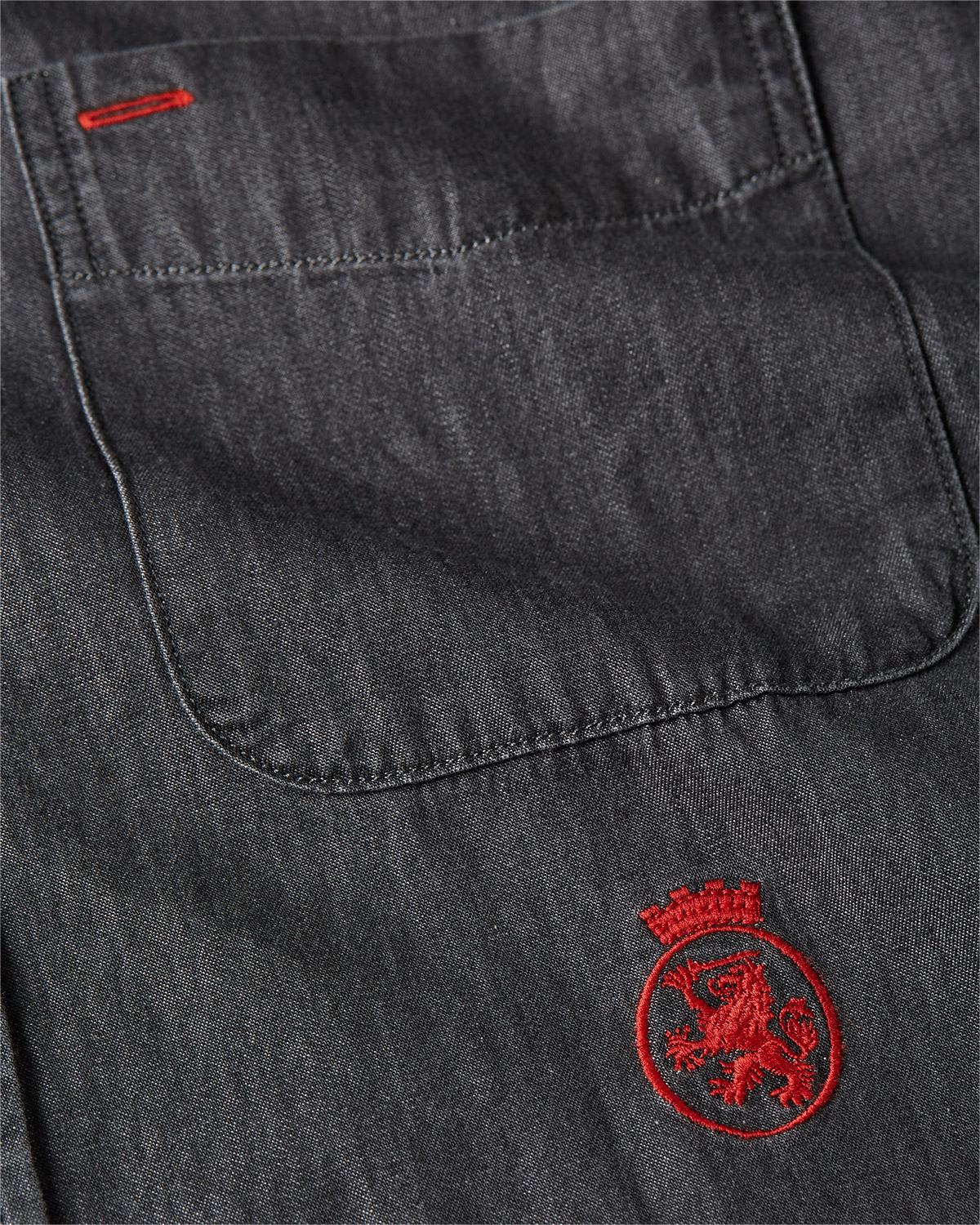 赤い刺繍のクレストはポケットにではなく、すぐ下に配置。こなれた風合いのブラックデニムシャツに、さりげない高揚感をもたらす。