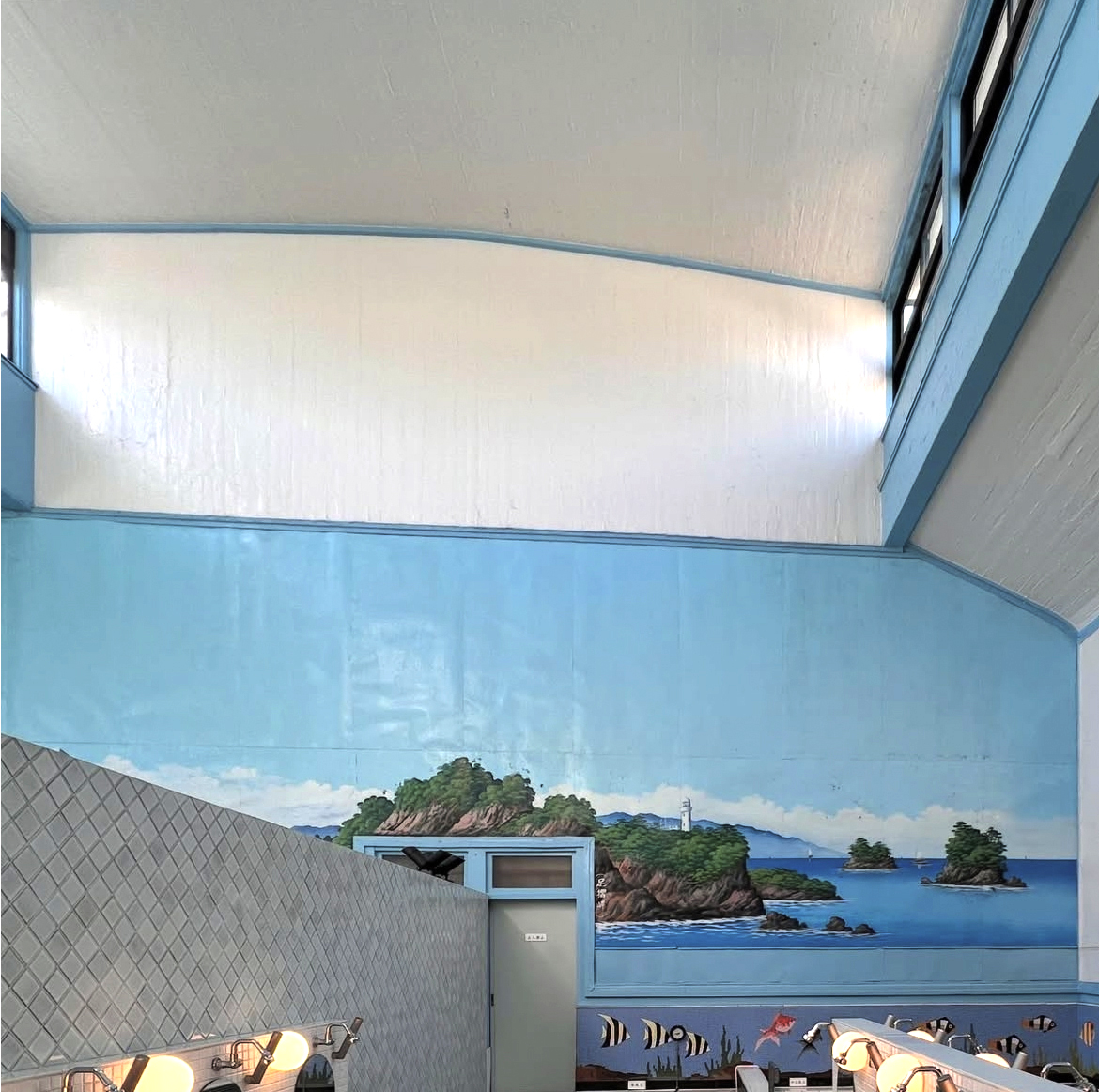 ペンキ絵はというと、男湯は富士山、女湯はなぜか四国の足摺岬で、断崖絶壁にぽつねんと描かれた灯台が「人は所詮ひとりで生きゆくもの…」と見る者に悟りをうながす。