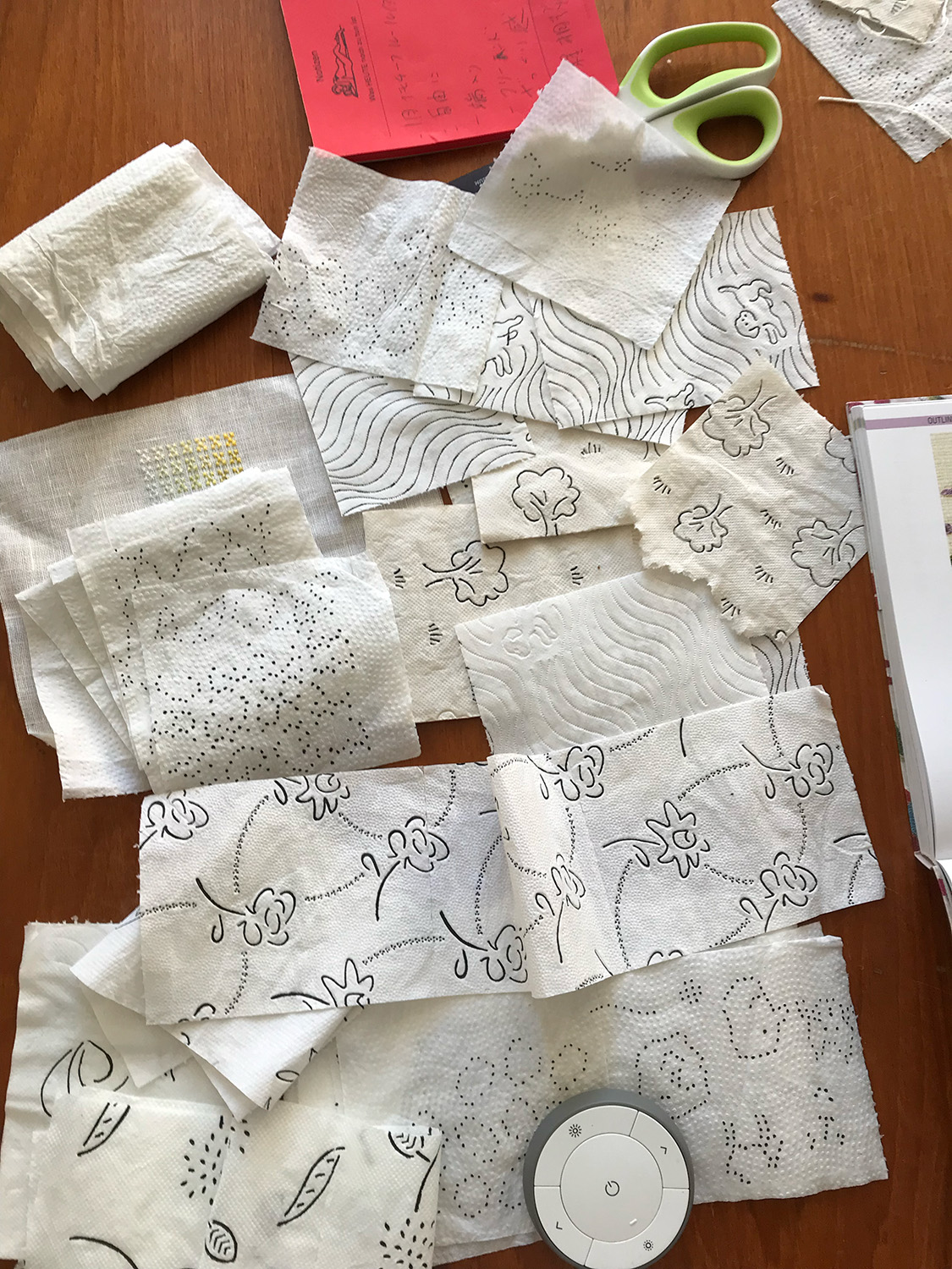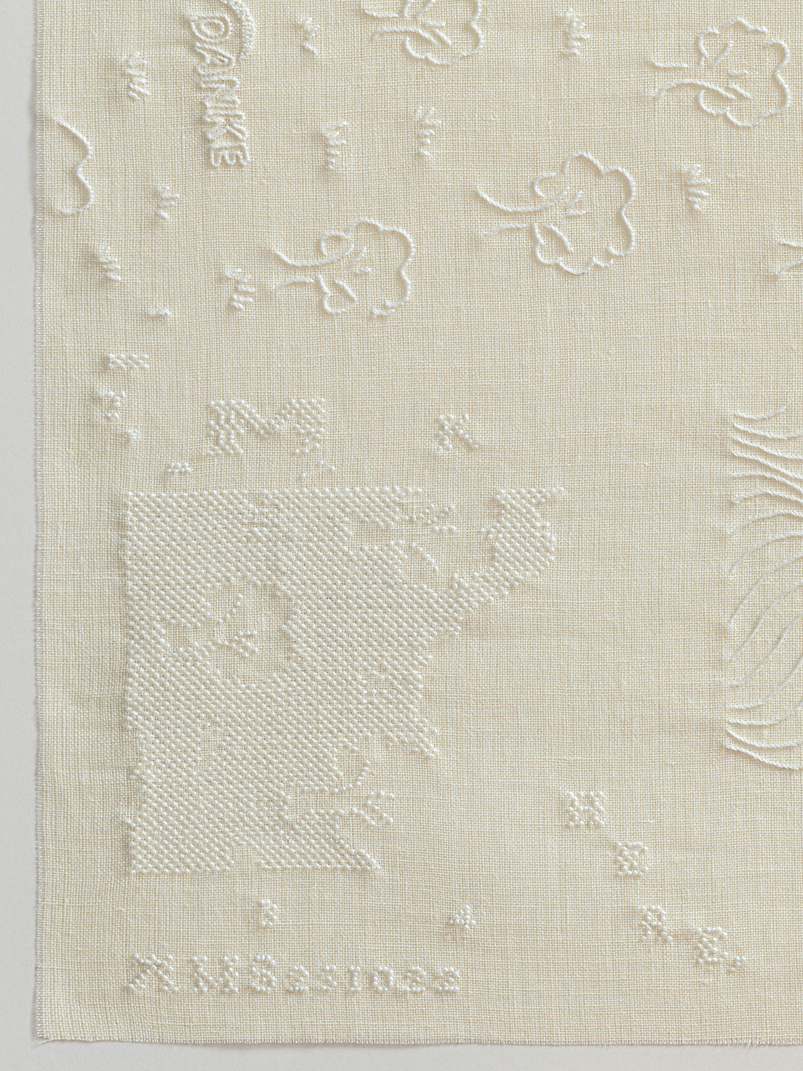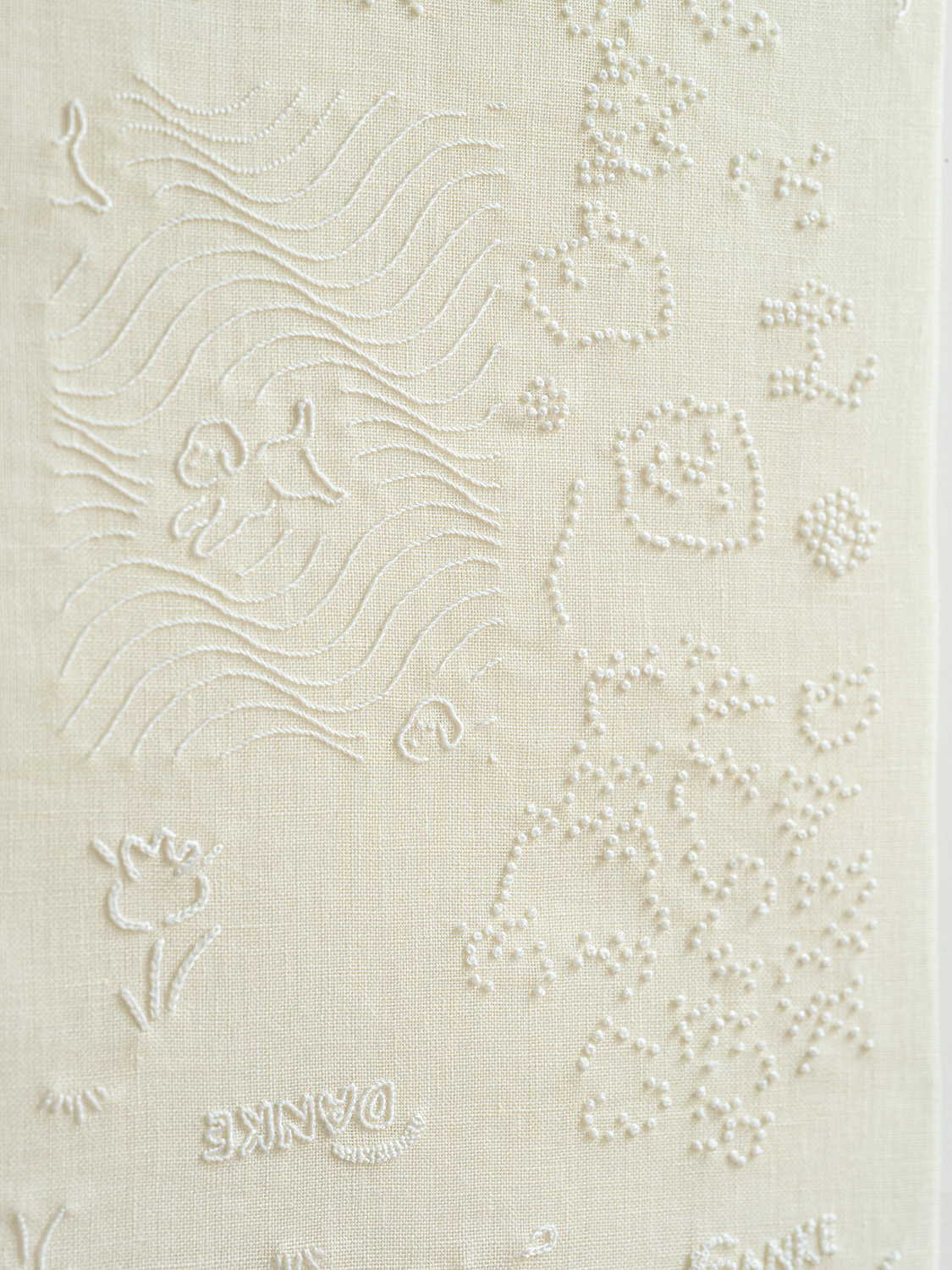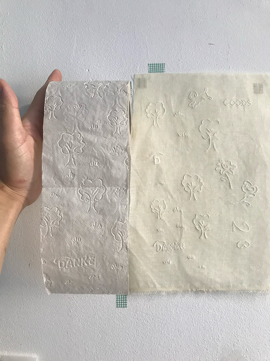 数年前、古物らのお店Goodsの方から刺繍のイメージをプリントした包装紙を作らないかというお話を頂いた時に、あのDanke を使って何かしたいとすぐにピンときました。包み紙にDankeと書いてあったら用途的にもしっくり、そして出所がトイレットペーパーであるという可笑い楽しさもあるのではと提案したら、それでいきましょう!ということに。最終的にはオランダのスーパーマーケットで手に入る他のブランドのエンボス柄もいくつか組み合わせ、刺繍を施しました。