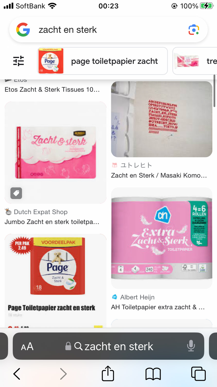 トイレットペーパーの収集時にzacht en sterk (蘭語で柔らかく、そして強い)という言葉が謳い文句として多用されていることに気づきました。なんだか気に入いってしまい座右の銘にすることに。2023年に東京の書店Utrecht にて初めてさせていただいた展示のタイトルとしても使いました。