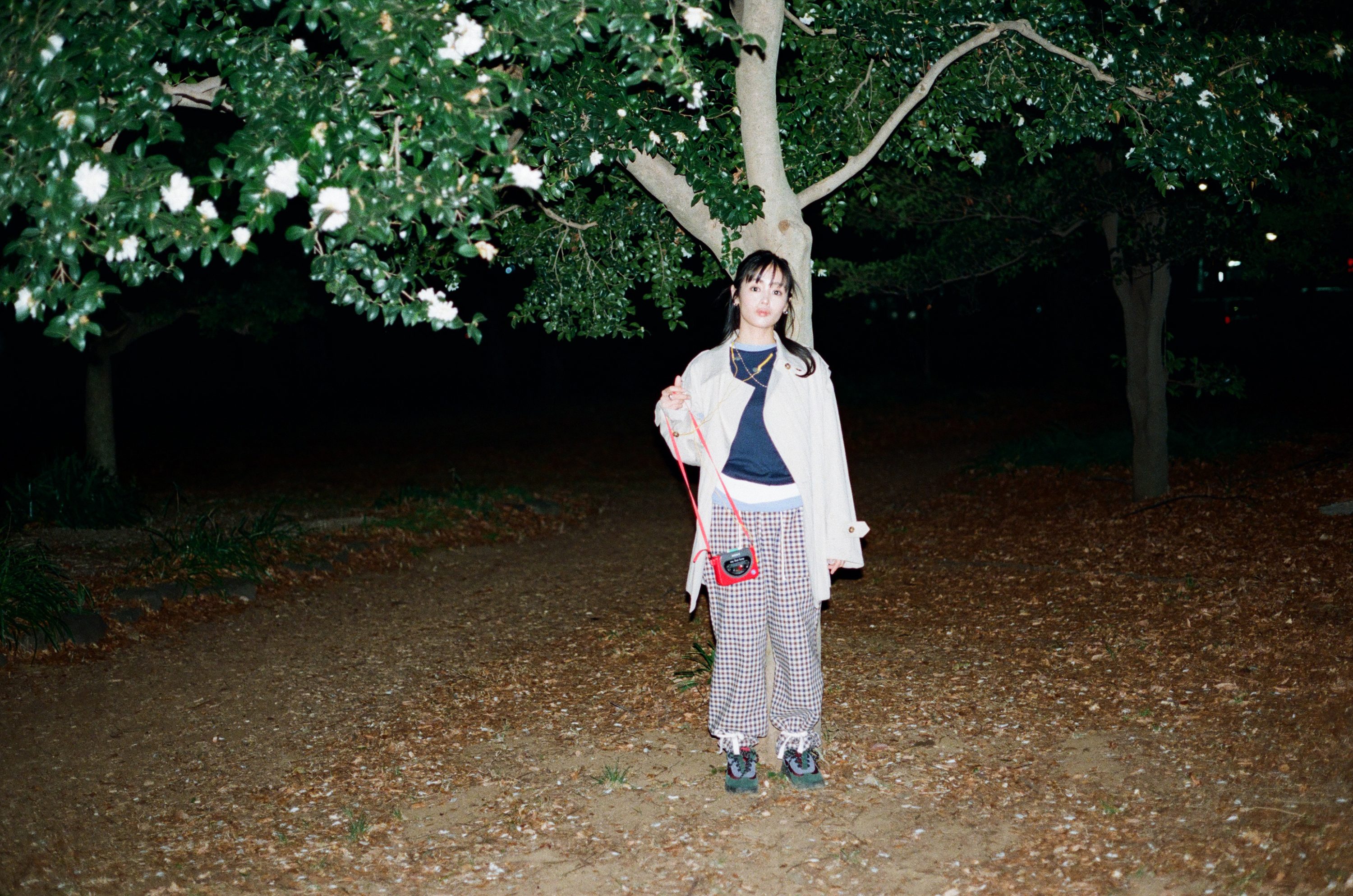 トレンチコート¥55,000(ヴェニット/ハルミ ショールーム☎03·6433·5395) ネイビーのトップス¥37,400(アカネ ウツノミヤ☎03·3410·3599) 中に着た水色のカットソー¥31,900、パンツ¥72,600(ともにサワ タカイ support@sawatakai.com) シューズ¥35,200(パープレッド☎03·3410·3599) ピアス¥12,100、ネックレス¥81,400、リング¥29,700(すべてガガン☎070·3321·1424) カセットプレーヤー¥24,000、ヘッドホン¥20,000(ともにスタビリティ)