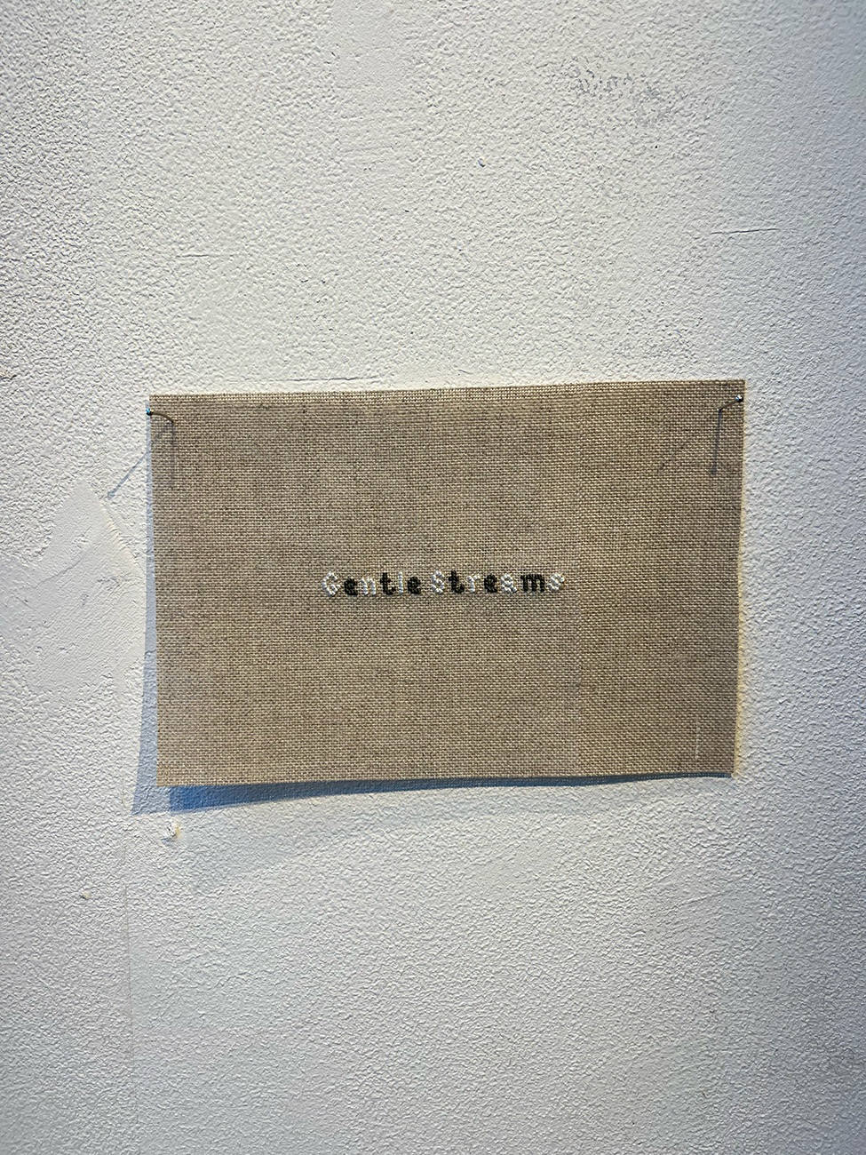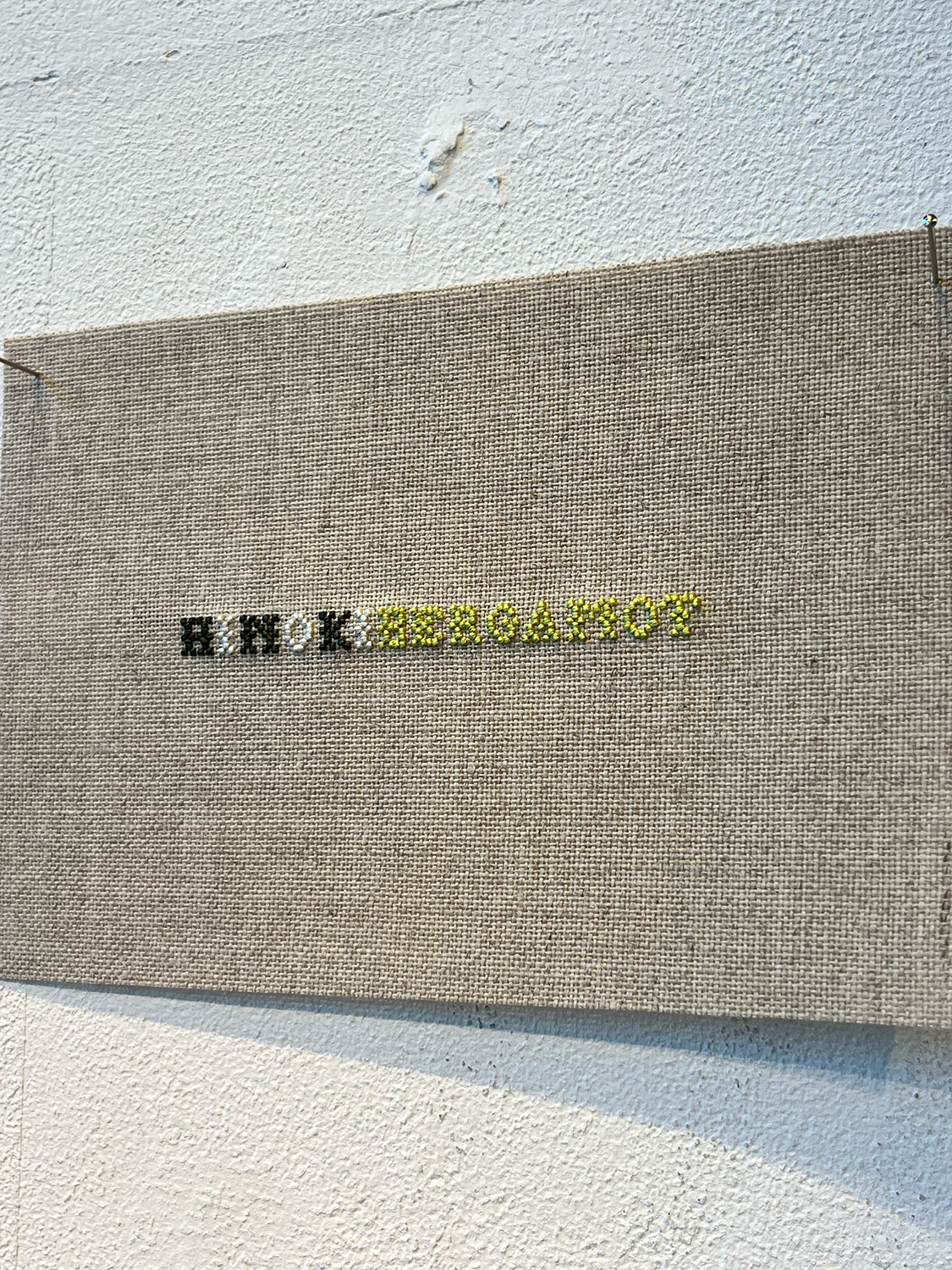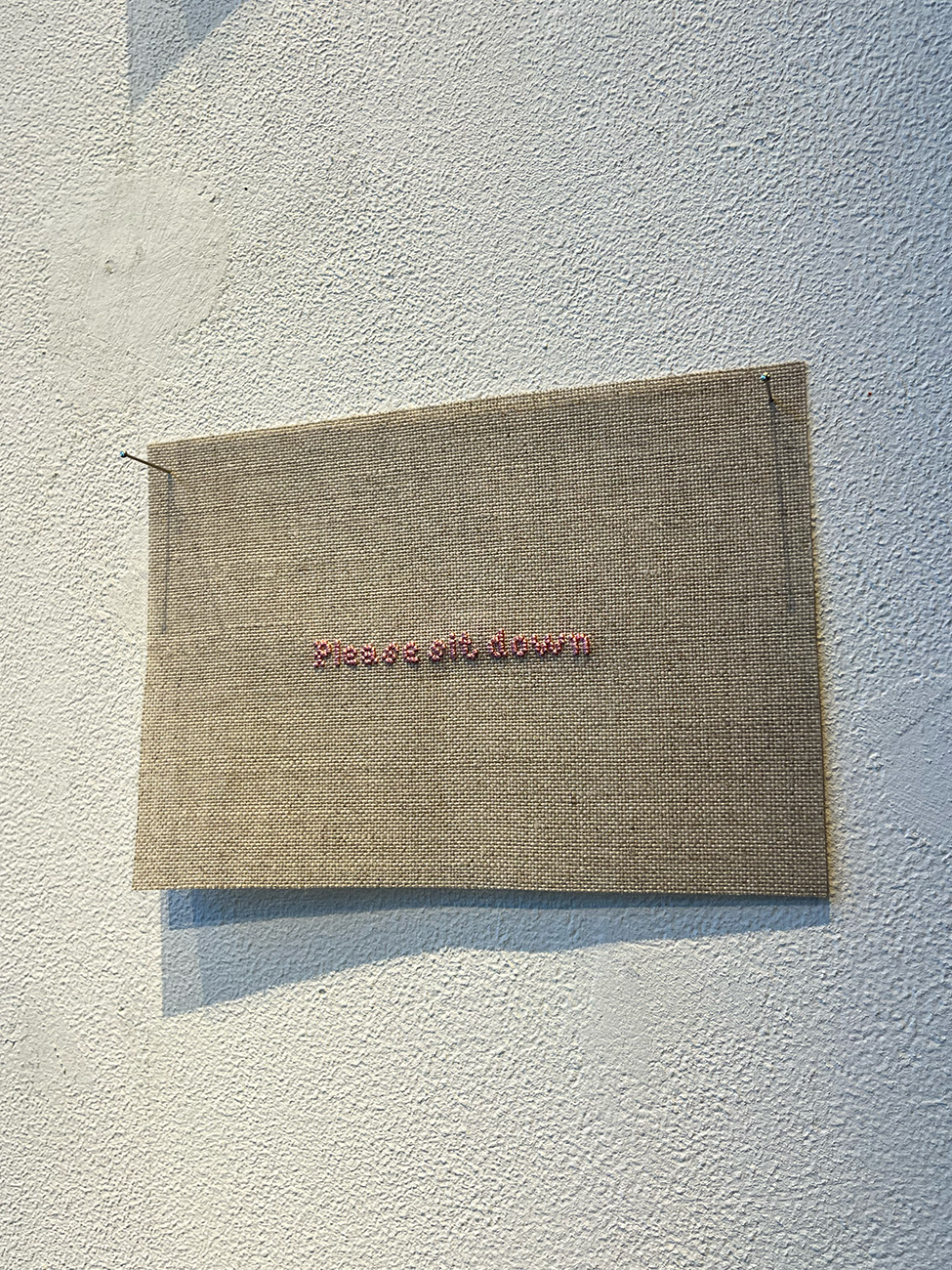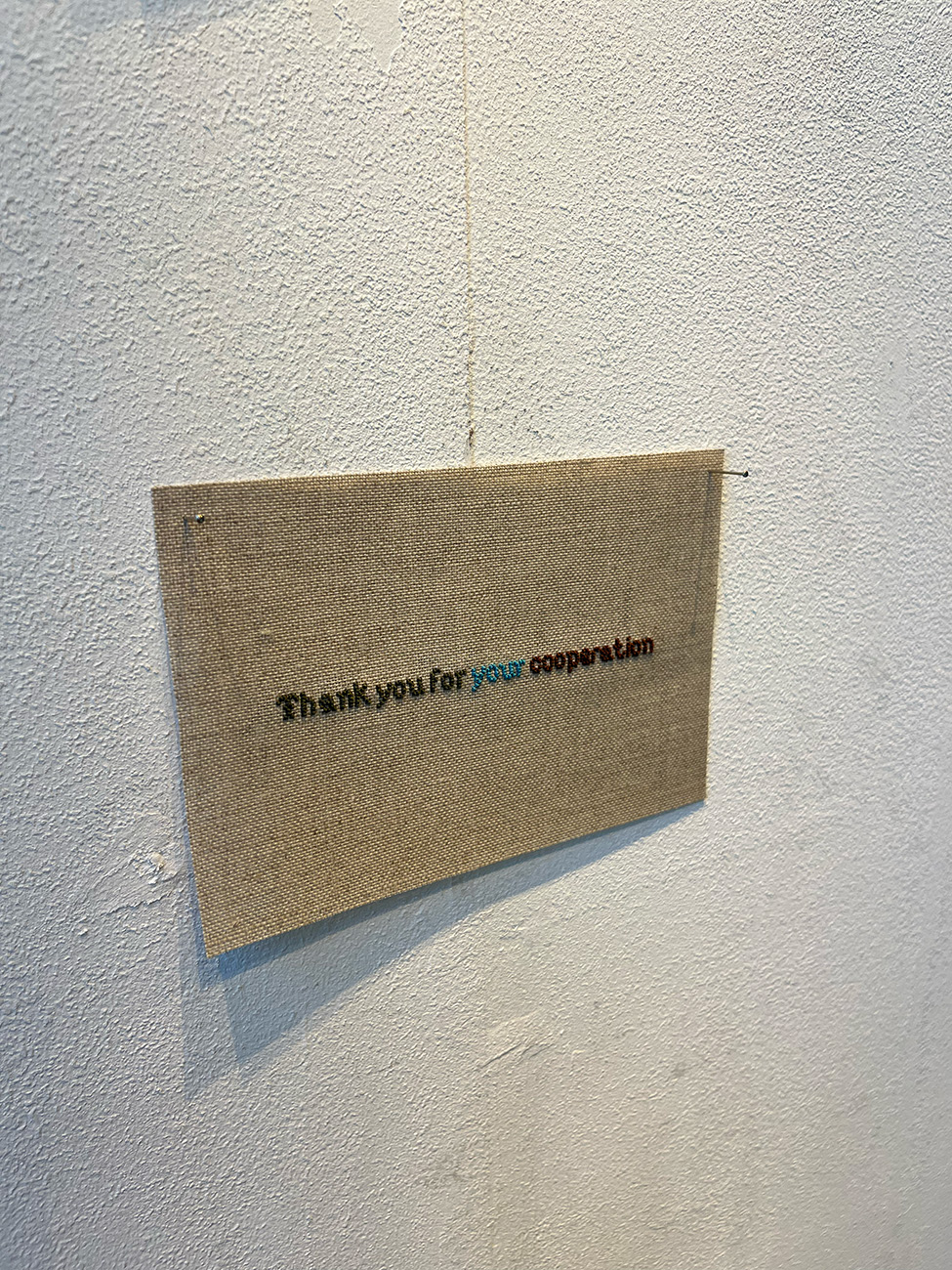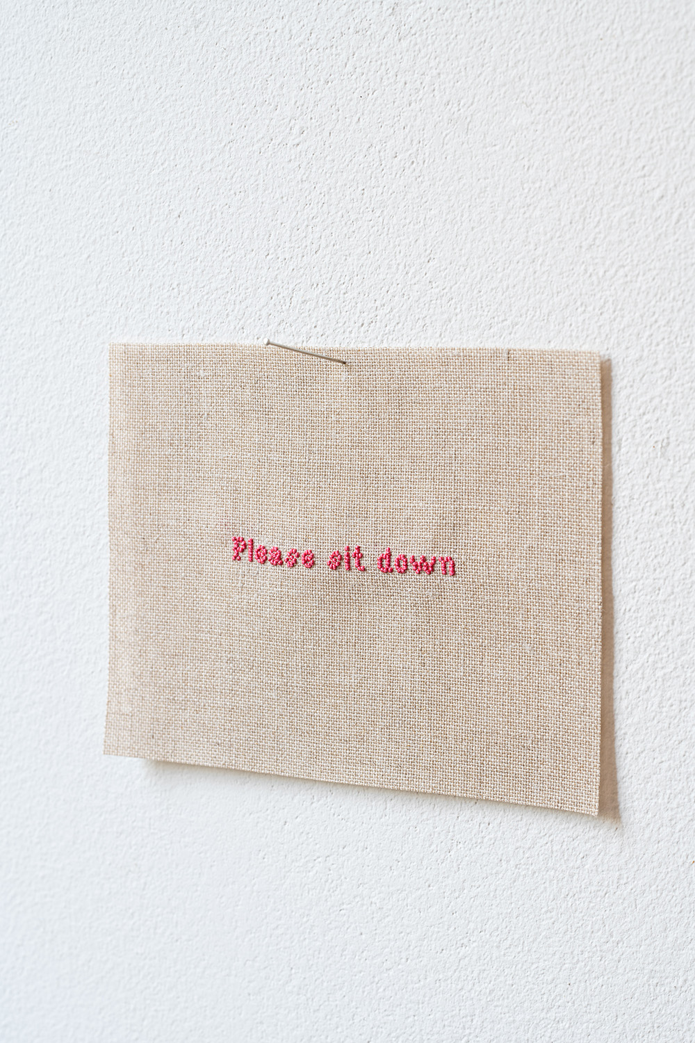 まずは張り紙やシールから直接影響を受けたものたち。踏襲したかったのは、要求するにもあくまで丁寧に、というところ。そこから、光沢感のあるシルクの糸で文字を小さめに刺しエレガントな雰囲気を演出する、という方向性を導きました。さりげなさすぎてそもそも何書いてるかよく分からない、なんていうツッコミも飛んで来そうですが、あのトイレの布なに?くらいの軽い疑問から会話が生まれるきっかけになったとしたら、それはそれで一つの作品の在り方だと前向きに捉えてみます。言葉選びはストレートなものにしたり、少し含みを持たせた曖昧な表現にしてみたり。