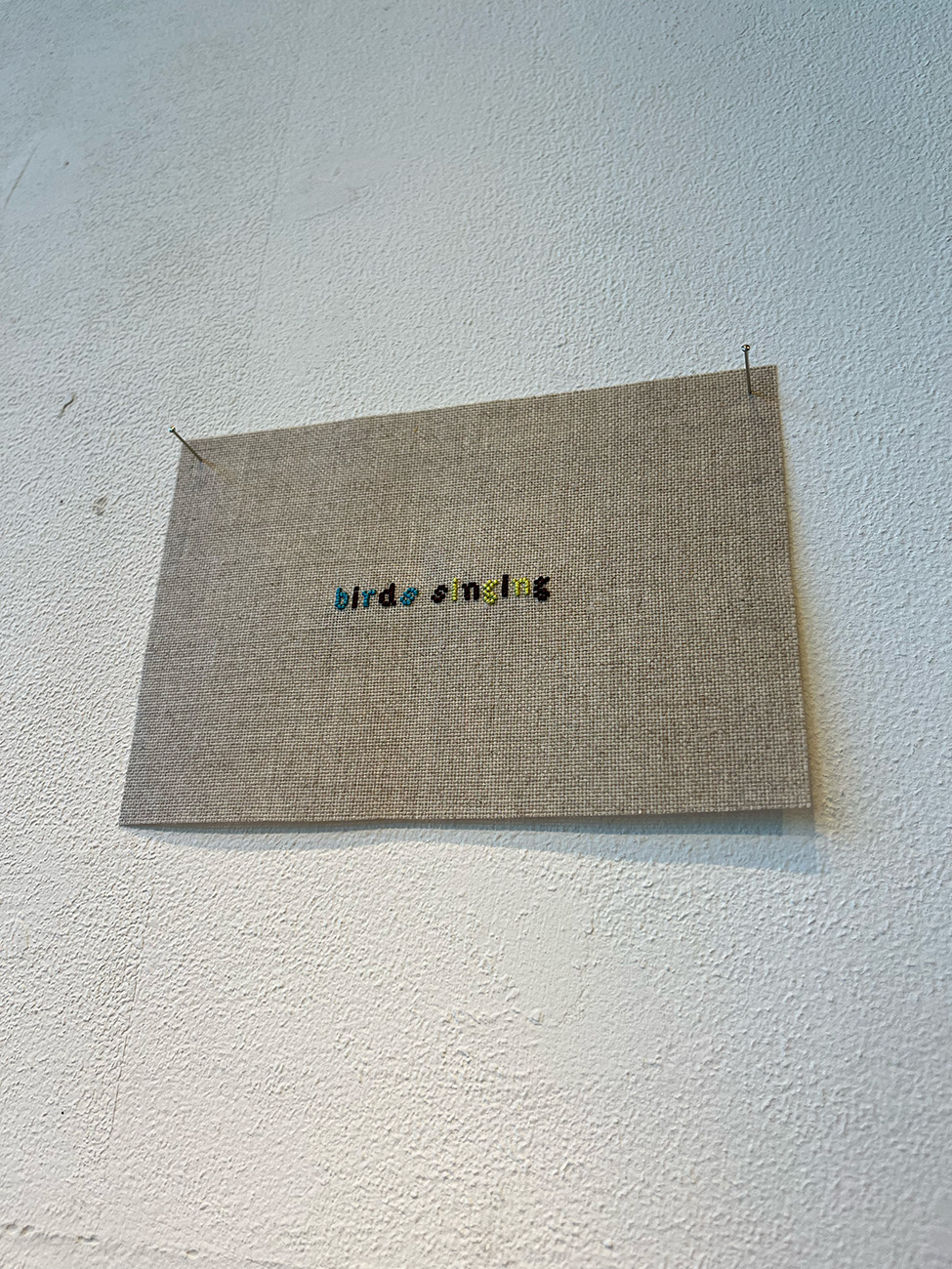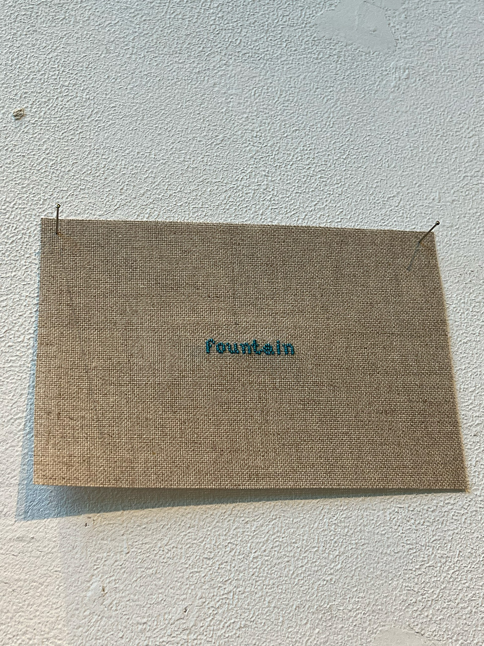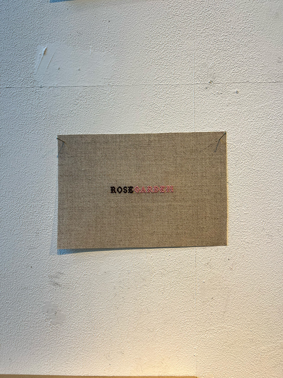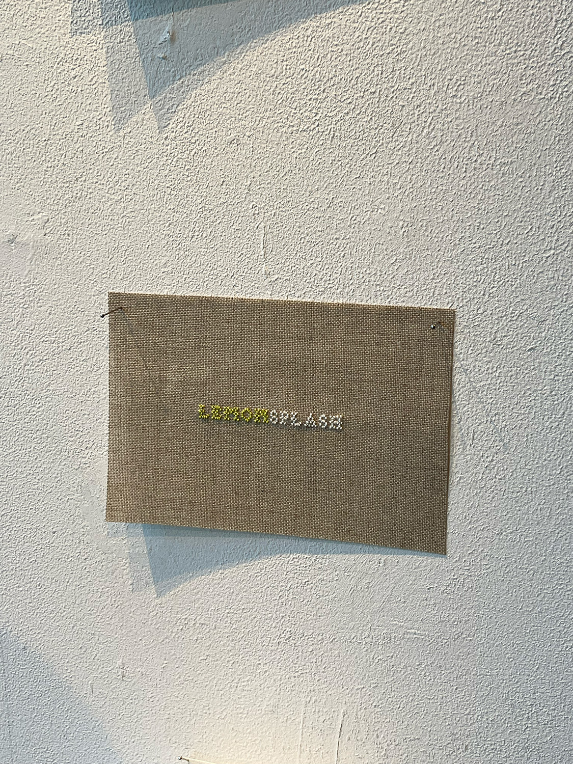 どこかの玄関で見たことあるようなWelcome Homeや優しげなハートの手芸作品を参照にしたり、実家のトイレの置物の記憶を辿ってみたり。言葉をモチーフとして扱いたかったということもあり、ポストカードサイズの布にトイレにまつわる一言をクロスステッチという極シンプルなアイデアで進めることに。