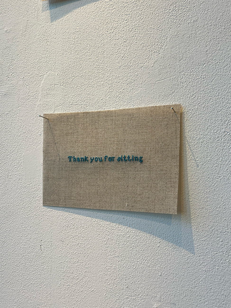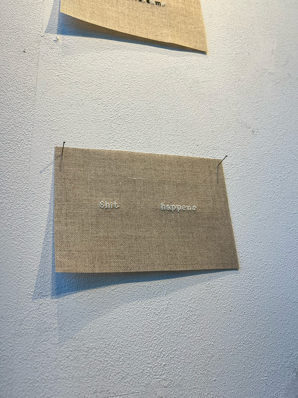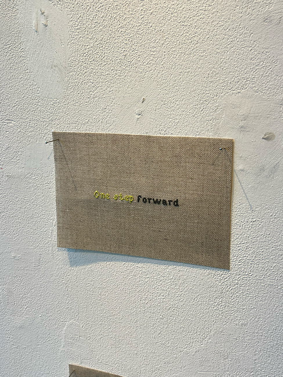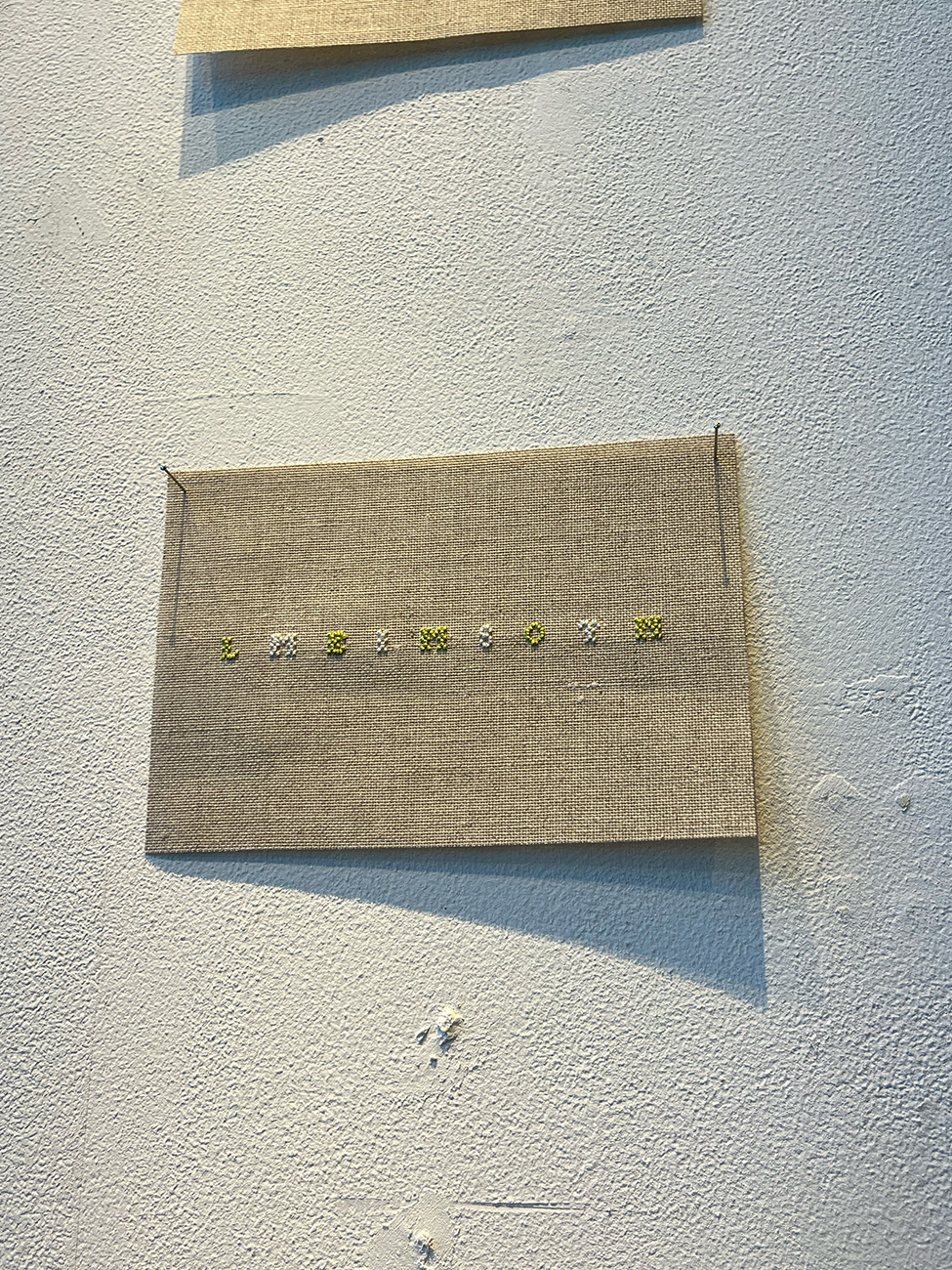 どこかの玄関で見たことあるようなWelcome Homeや優しげなハートの手芸作品を参照にしたり、実家のトイレの置物の記憶を辿ってみたり。言葉をモチーフとして扱いたかったということもあり、ポストカードサイズの布にトイレにまつわる一言をクロスステッチという極シンプルなアイデアで進めることに。