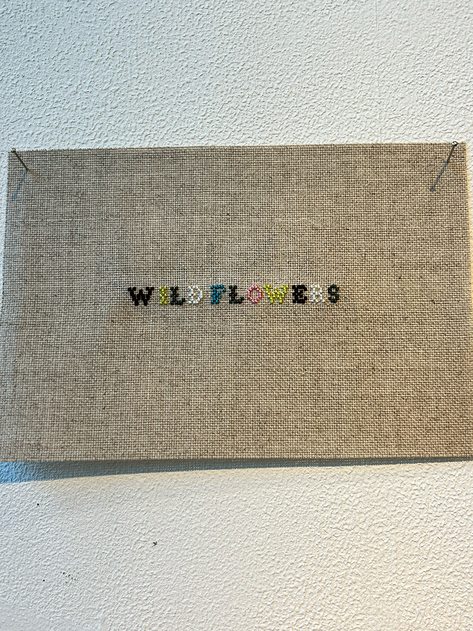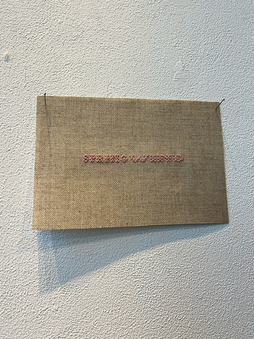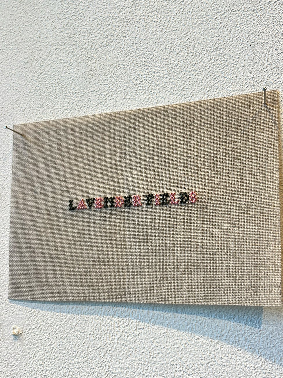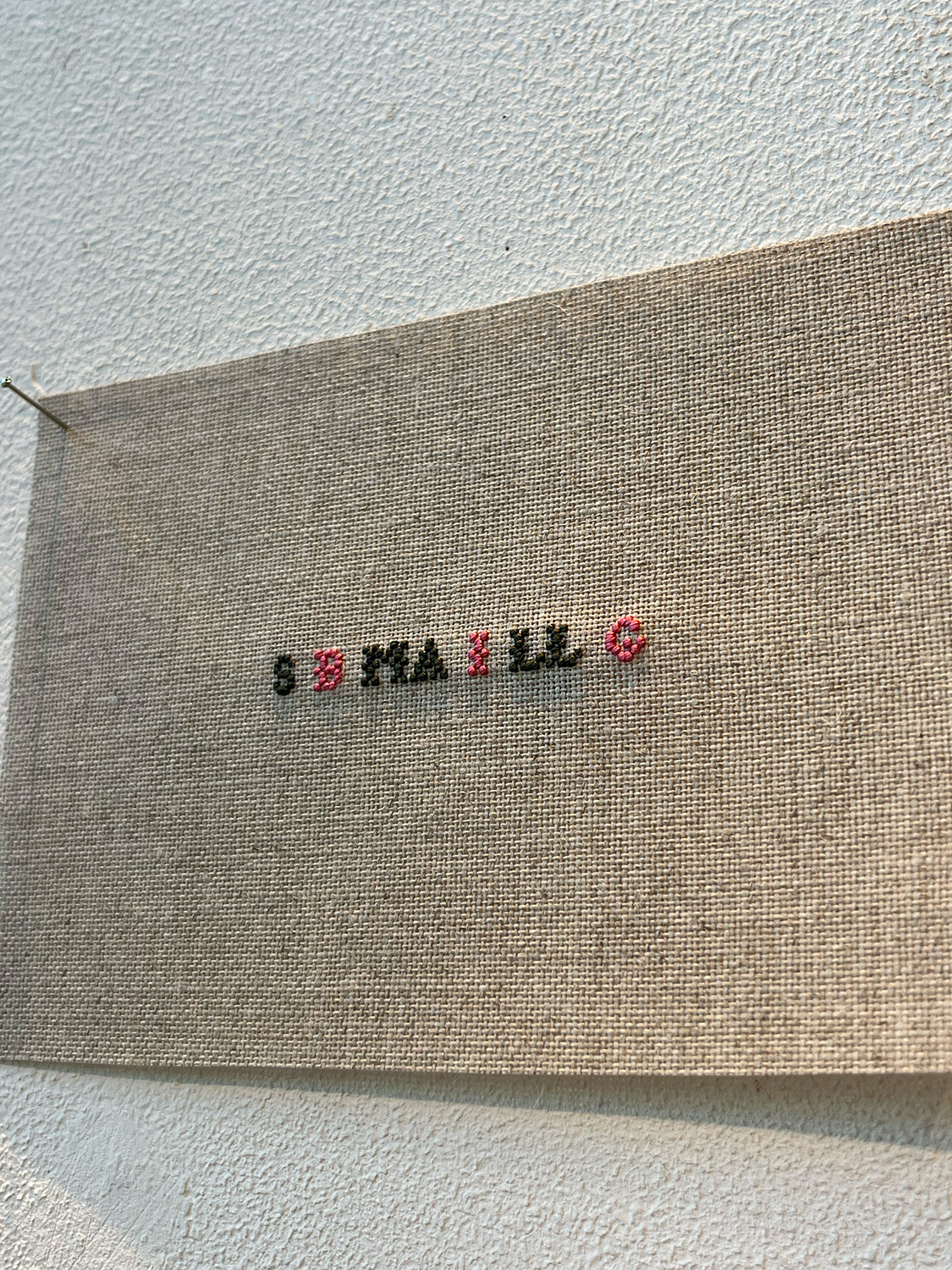 どこかの玄関で見たことあるようなWelcome Homeや優しげなハートの手芸作品を参照にしたり、実家のトイレの置物の記憶を辿ってみたり。言葉をモチーフとして扱いたかったということもあり、ポストカードサイズの布にトイレにまつわる一言をクロスステッチという極シンプルなアイデアで進めることに。