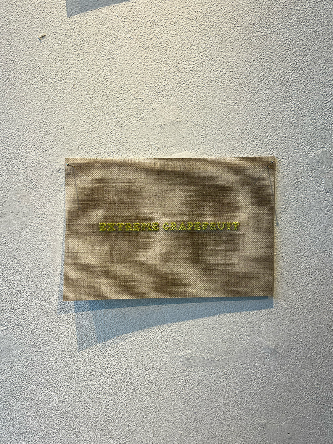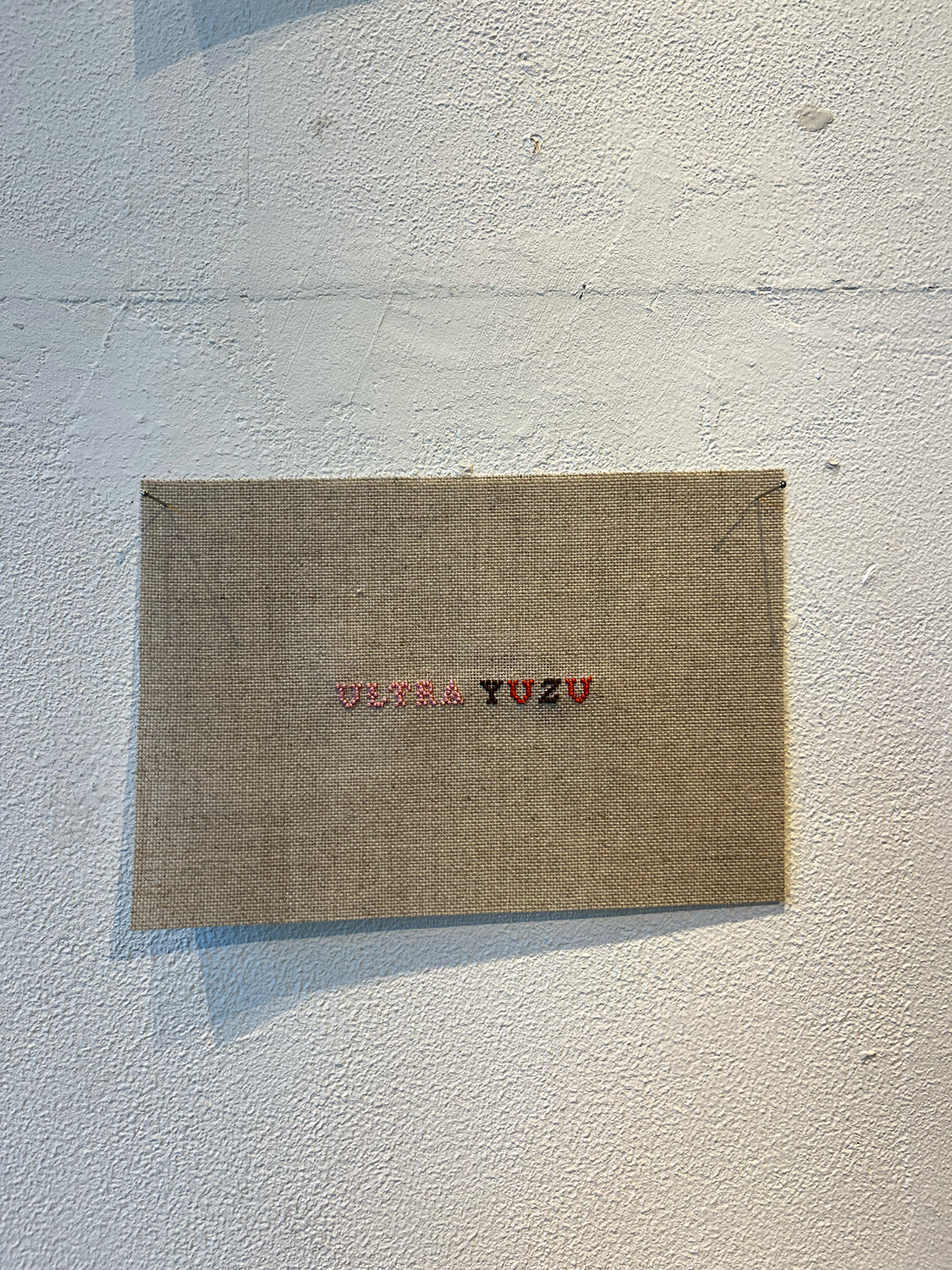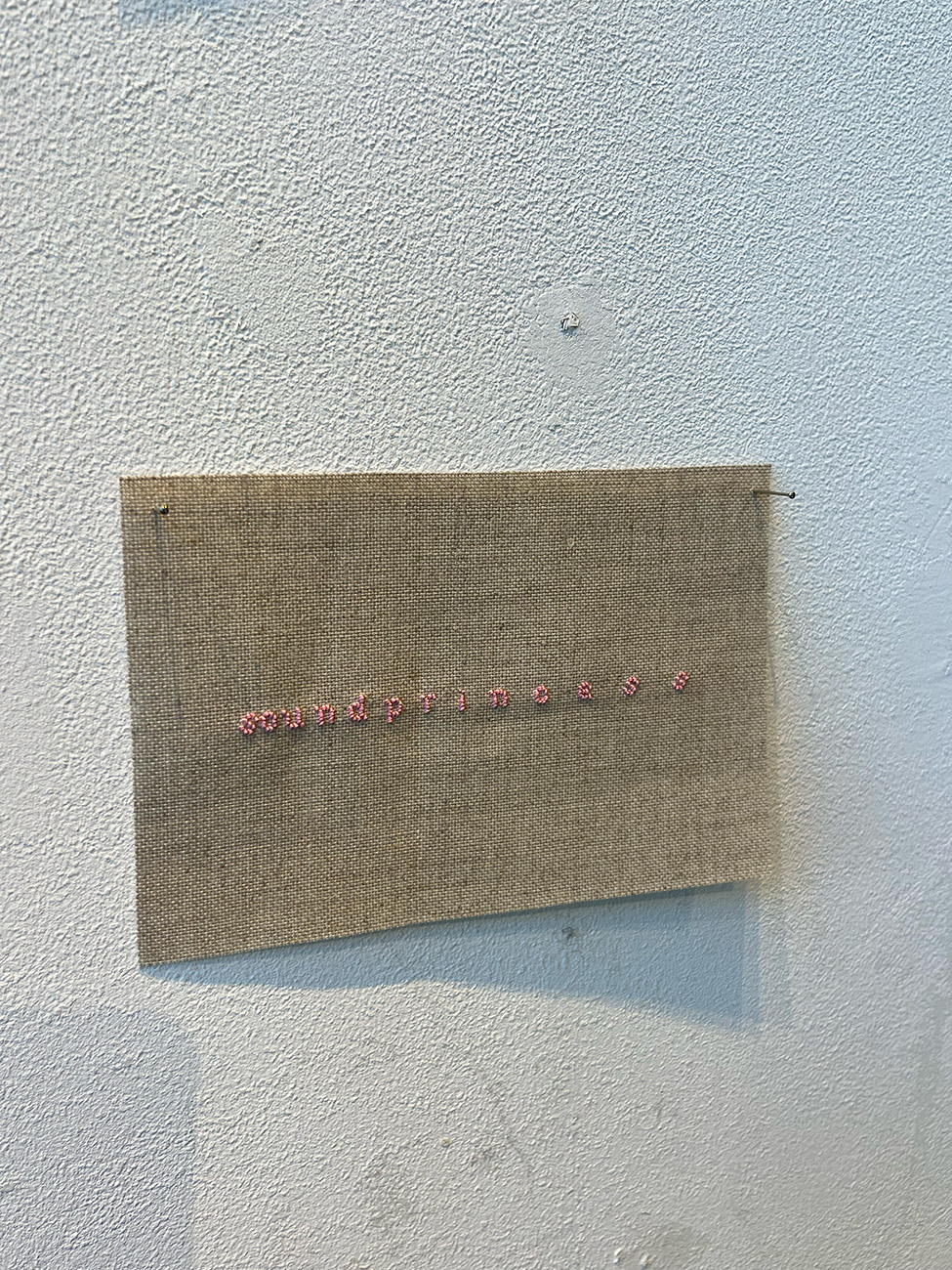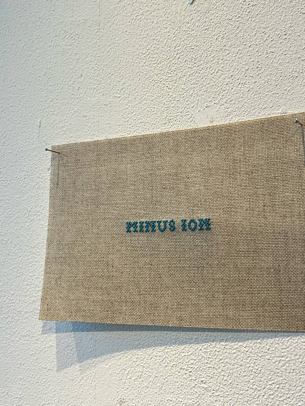 どこかの玄関で見たことあるようなWelcome Homeや優しげなハートの手芸作品を参照にしたり、実家のトイレの置物の記憶を辿ってみたり。言葉をモチーフとして扱いたかったということもあり、ポストカードサイズの布にトイレにまつわる一言をクロスステッチという極シンプルなアイデアで進めることに。