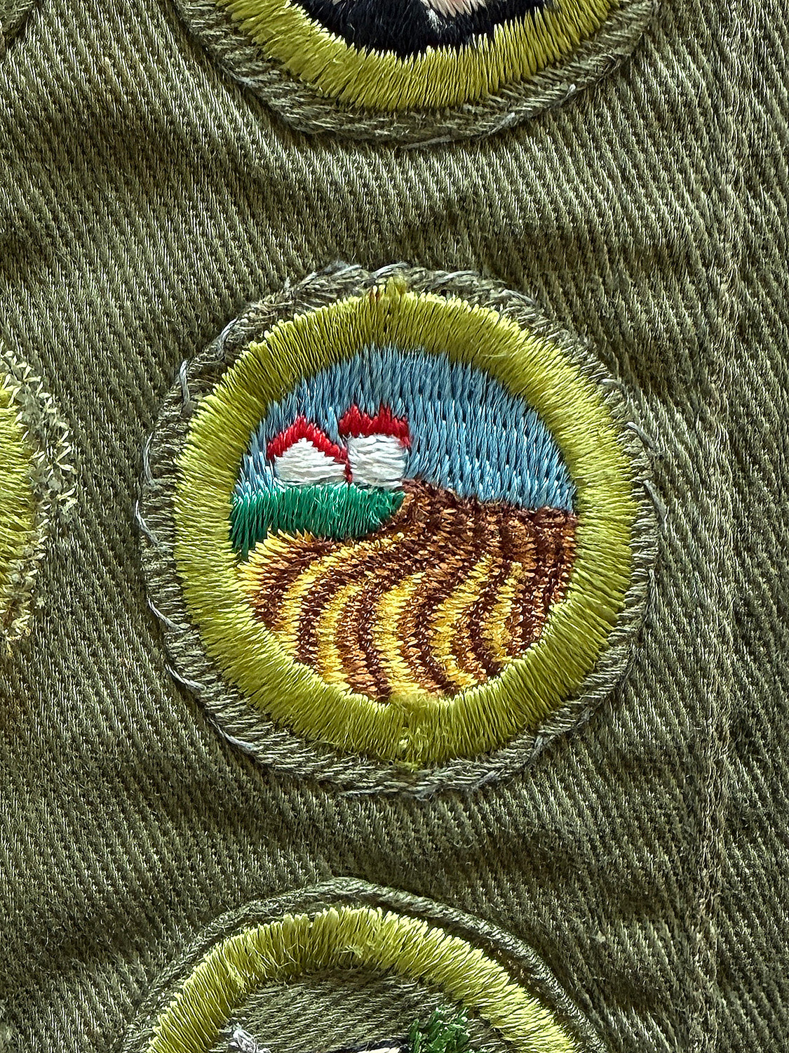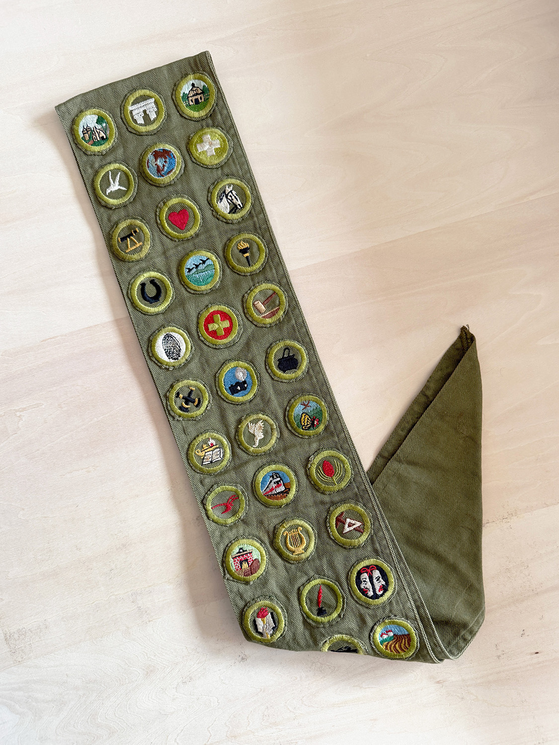このタスキに付けられたワッペンは、ボーイスカウトの活動で何かを達成する度に与えられるものらしく、色々な絵柄があります。