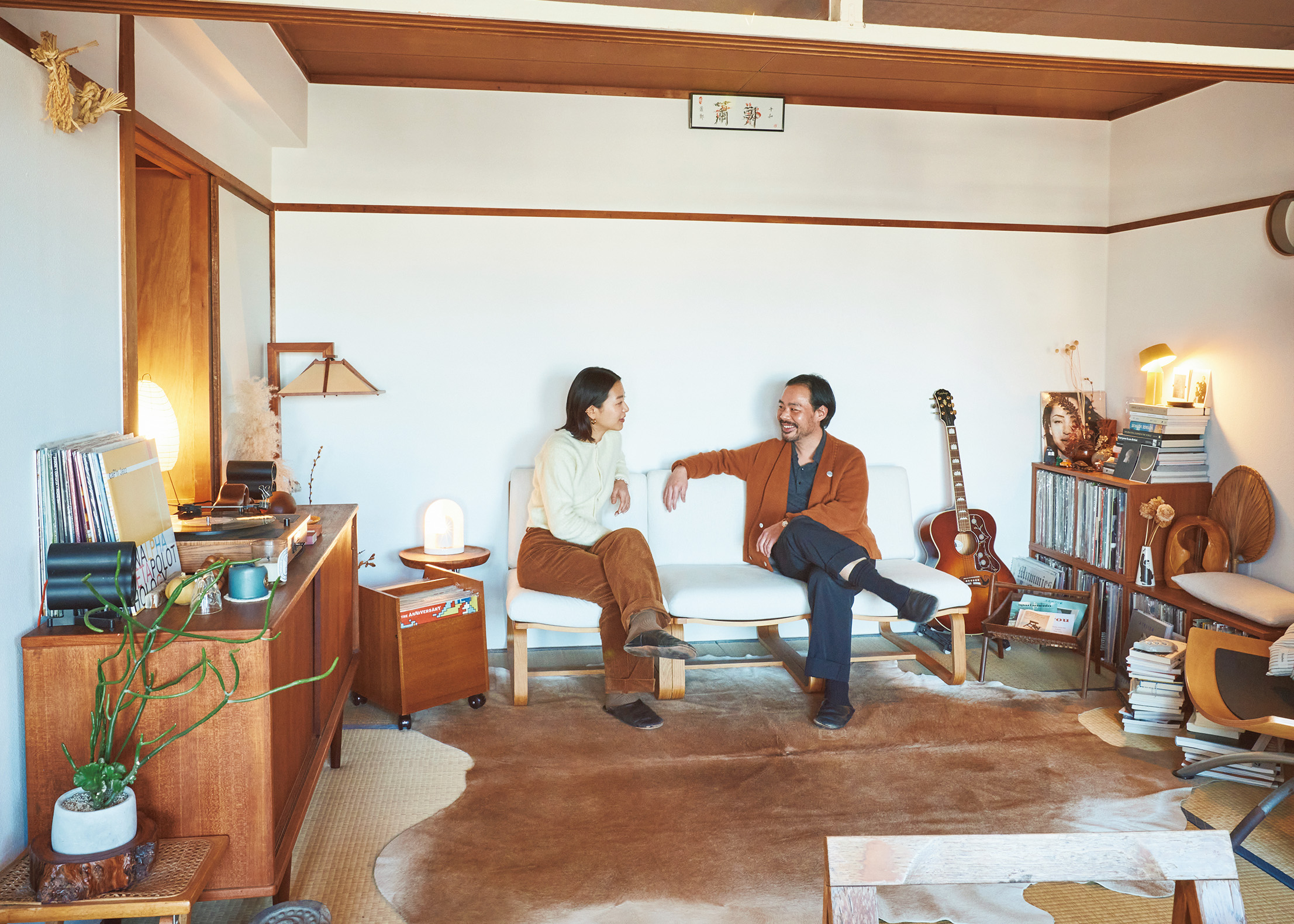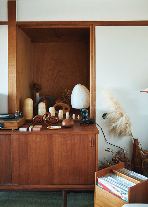 「この物件を選んだ理由は、大好きな和室がリビングも含め3部屋もあるから」と口を揃えるのは、台湾系アメリカ人のジョシュア シャーオさんと韓国人のチョン・ユジさん夫妻。しかし和家具は敢えて取り入れず、脚のある西洋家具たちが堂々と並ぶのが面白い。「デンマークの’60年代のサイドボードや’70年代のウッドカービングを筆頭に、家具や雑貨はほとんどチーク。この素材でまとめると、畳特有の温かいムードがさらに引き立つんです」