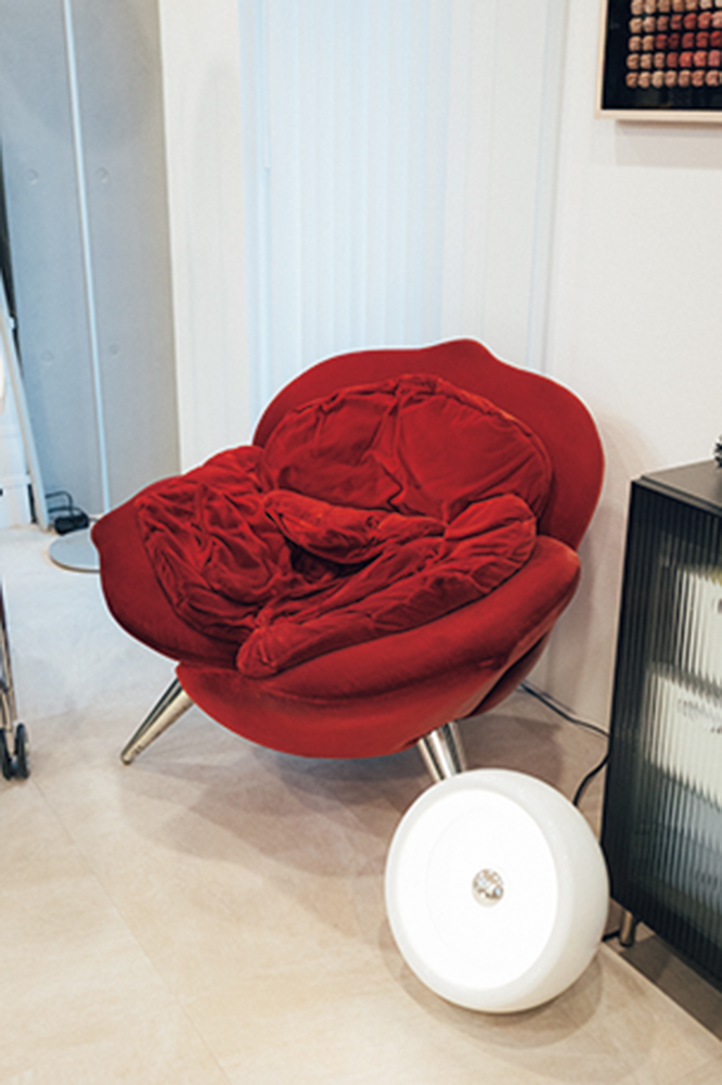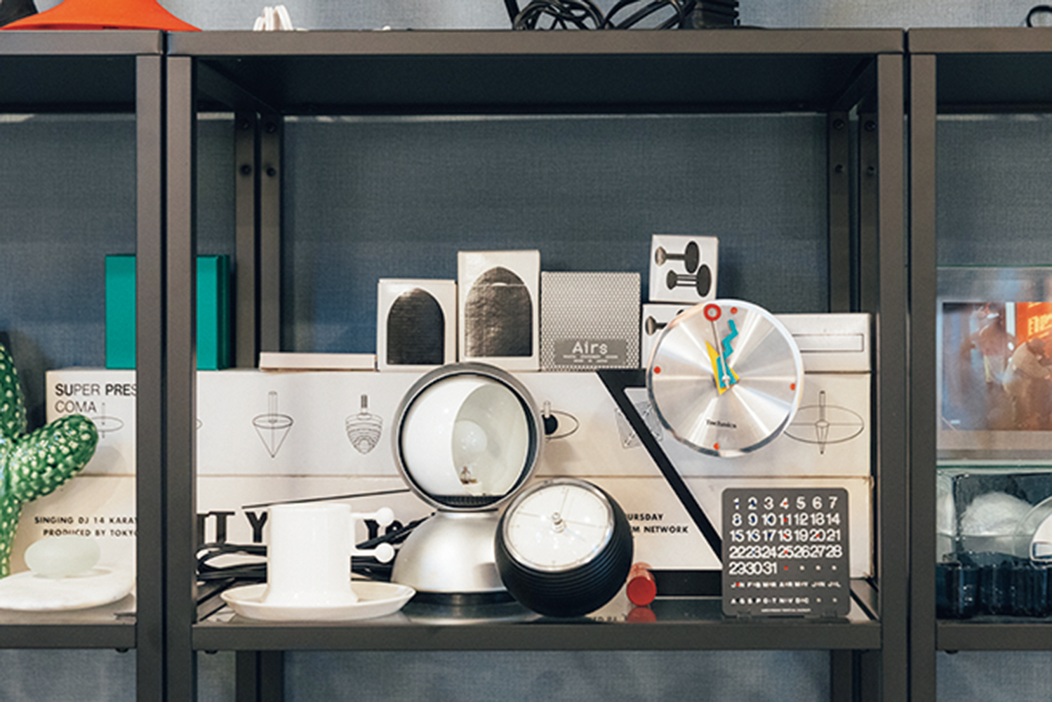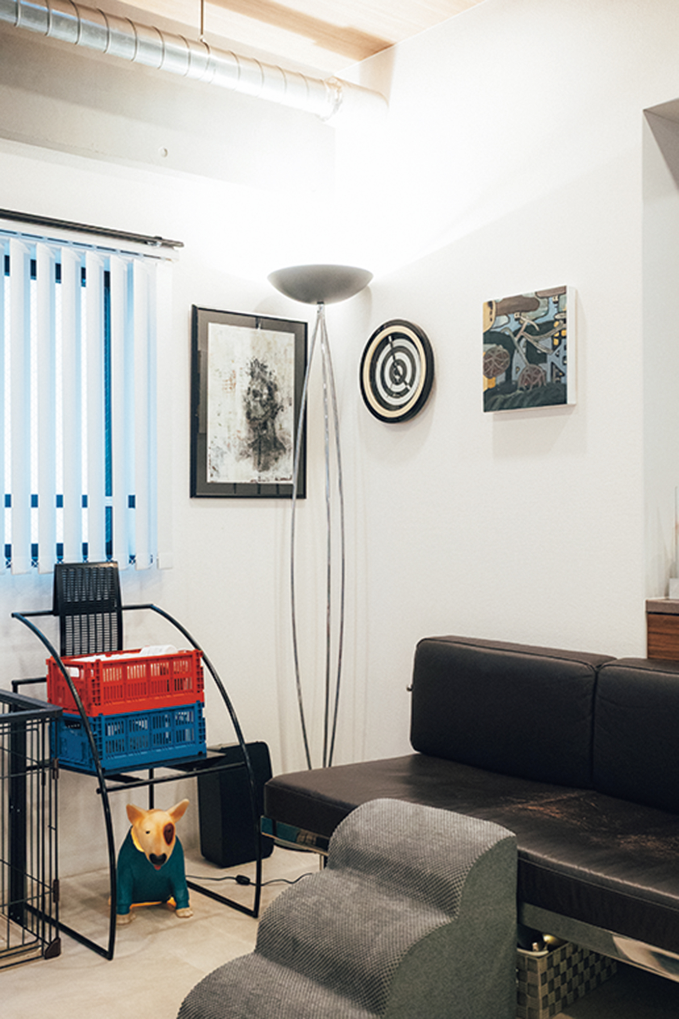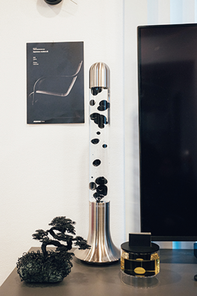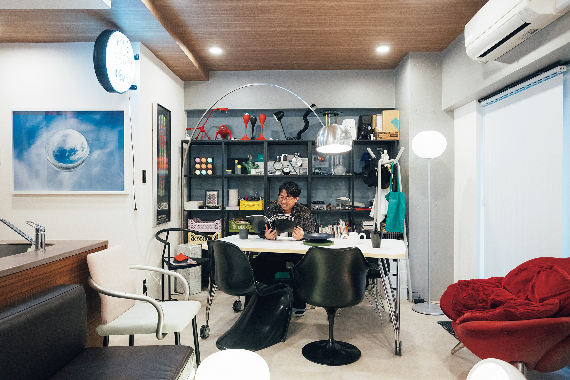 コンクリート打ちっぱなしのモダンな内装に、珍しいプロダクト&アートピースが並ぶ一室。壁際のラックに並ぶコレクションなど気になるものはいっぱいだけど、なかでも目を引くのが、〈フロス〉のアルコをはじめとする、たくさんの照明たち。「ひとつの照明で部屋全体を照らすんじゃなくて、必要な場所に必要な明るさを置く“多灯分散”という手法を取り入れているんです。単純に照明が好きだから、増えちゃっただけなんですけどね(笑)」