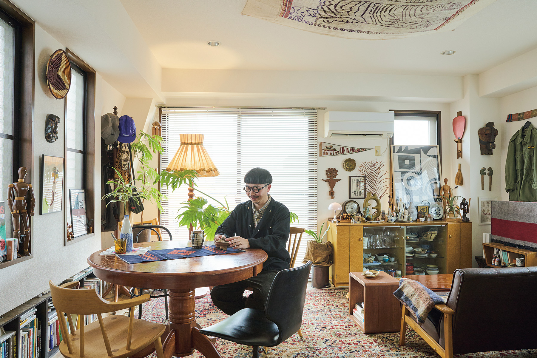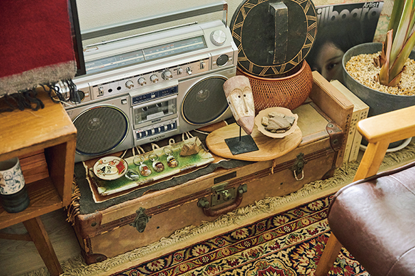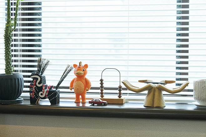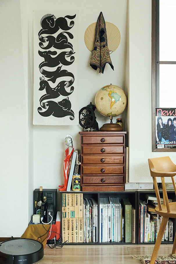 ソンゲ族のお面といったフォークアートや、八戸の郷土玩具八幡馬などの民芸品がぎっしり置かれた柳下桂一郎さんの部屋は、さながら文化人類学者の研究室。でも、ものでごちゃついてはいないし、古物ばかりでも古びた印象は受けない。「ガチャガチャしないように色のトーンは抑えめです。土器の横に土人形など材質が近いものを置きつつ、『ウルトラマン』のソフビ人形なども隙間に配置。趣味のものほど溶け込むように工夫して置きます」