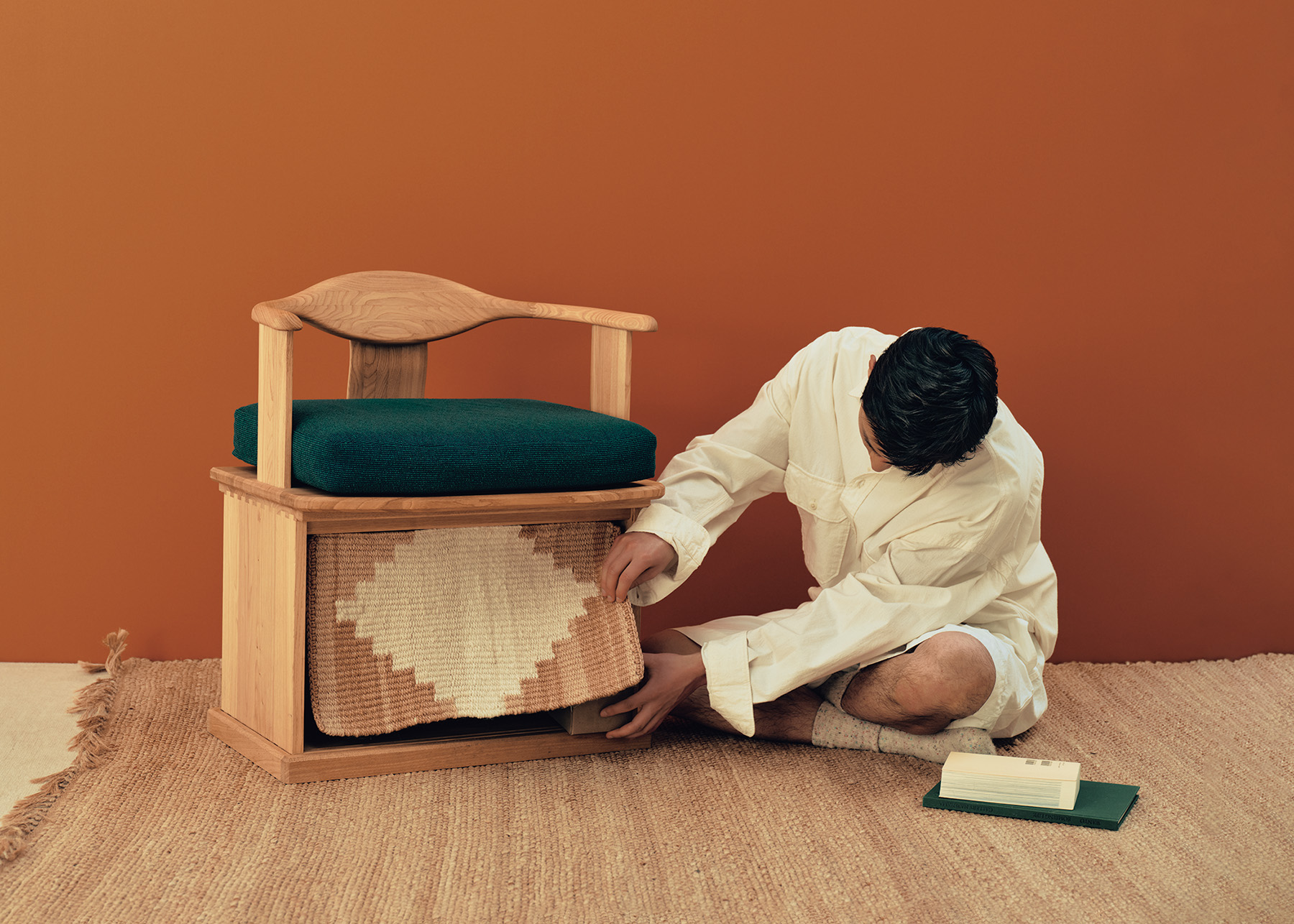 まさかの椅子と収納をドッキング。ありそうでなかった発明に膝をポンと打ったのが、〈ポスタルコ〉と〈カリモク家具〉による「スタッコ」シリーズ。チェアトップと箱型ブロックは、手回し可能なボルトで連結されたシンプルな構造なので、椅子の役目をお休みして、棚に転用することも。引っ越しや家族構成の変化とともに自在にトランスフォーム。¥252,670※クッションとラグをオプションで付けた場合(カリモク家具☎0562·83·1111)