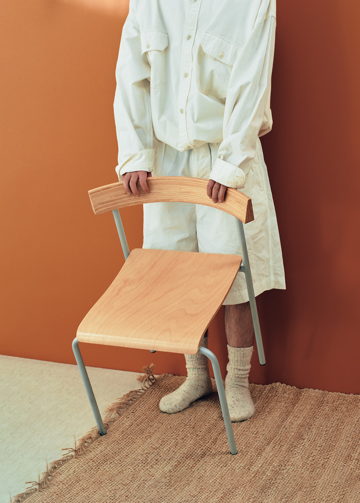 波打つプライウッドと、灰色のスチール材のシンプルな美しさ。見るほどに細部に惚れ惚れする「カンジチェア」は、アップルストア1号店にも関わったインテリアデザイナー、植木莞爾の作。谷口吉生の名建築のために作られたという来歴も素敵。¥63,800(コンプレックス ユニバーサル ファニチャー サプライ☎03·3760·0111)